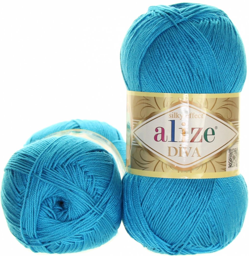 Alize Diva je oblíbená, lesklá příze, složená ze 100% akrylového mikrovlákna, vhodná pro pletení i háčkování letních úpletů, čepiček, triček, šatů, kloboučků a podobně s návinem 350 metrů. Váha 100g. Přibližná spotřeba na svetr velikosti 40 je cca 300 - 400 gramů.