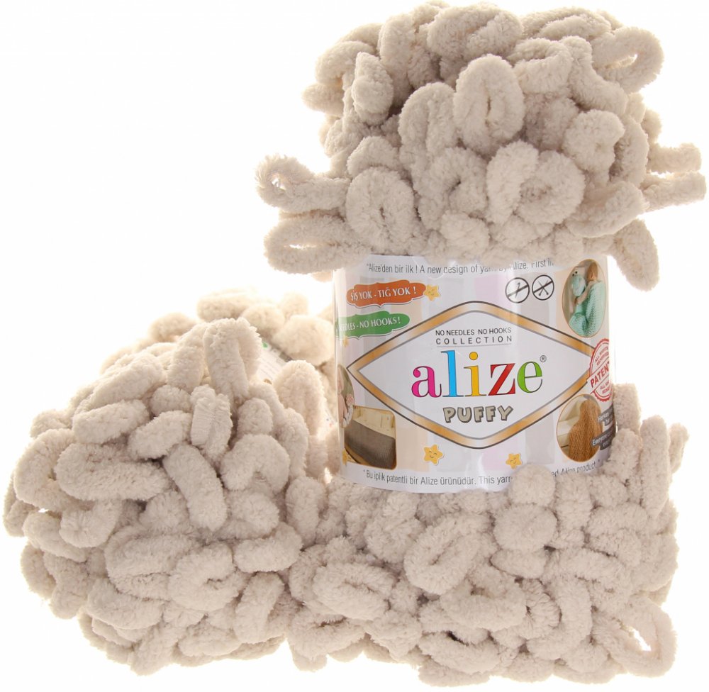 Alize Puffy je lehká, chlupatá a jemná polyesterová příze, která má oka na proplétání. Jedná se o relativně nový způsob kdy na práci s přízí nepoužíváte jehlice, nebo háček, ale používáte prsty. Na přiloženém videu se můžete podívat na ukázku jak snadno se s přízí pracuje. Na velkou deku 200x100cm spotřebujete cca 10 klubíček, na šálu Vám pak budou stačit dvě.