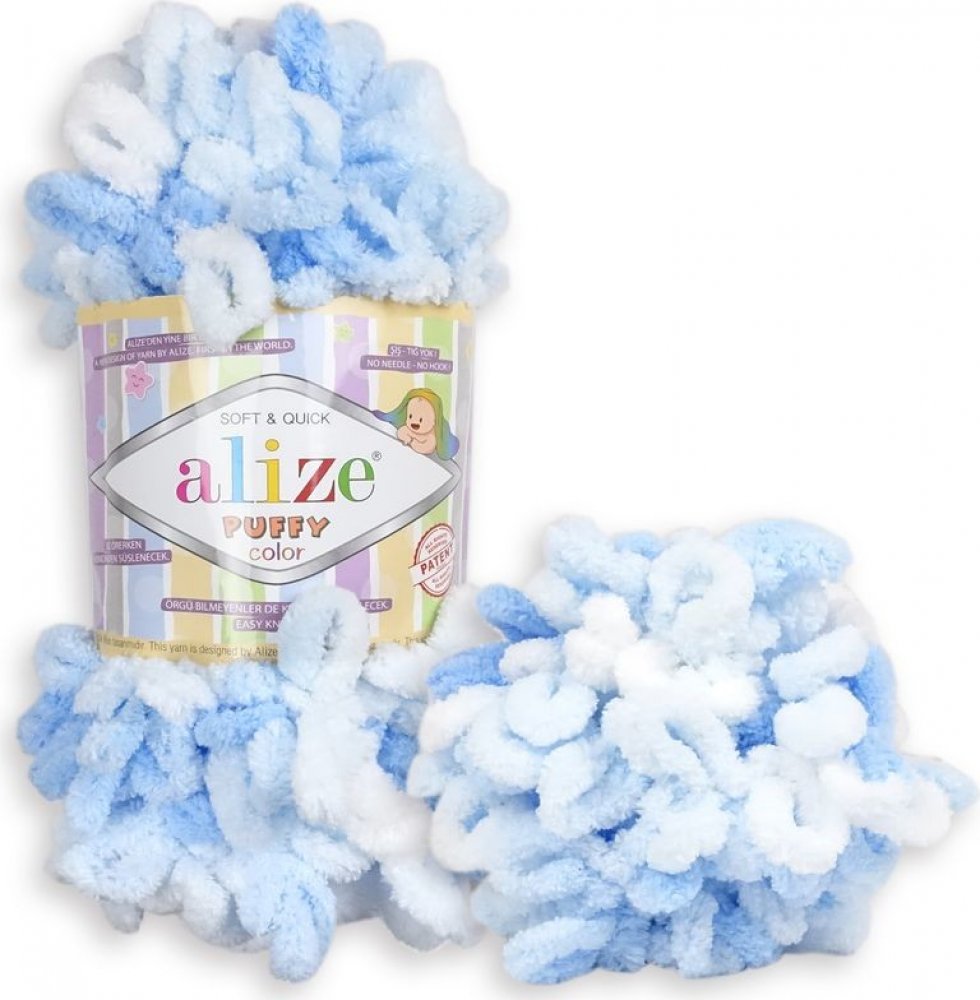 Příze s velkými oky vytváří melírovaný zrnitý barevný vzor. Směs modré a bílé, číslo barvy 5865.