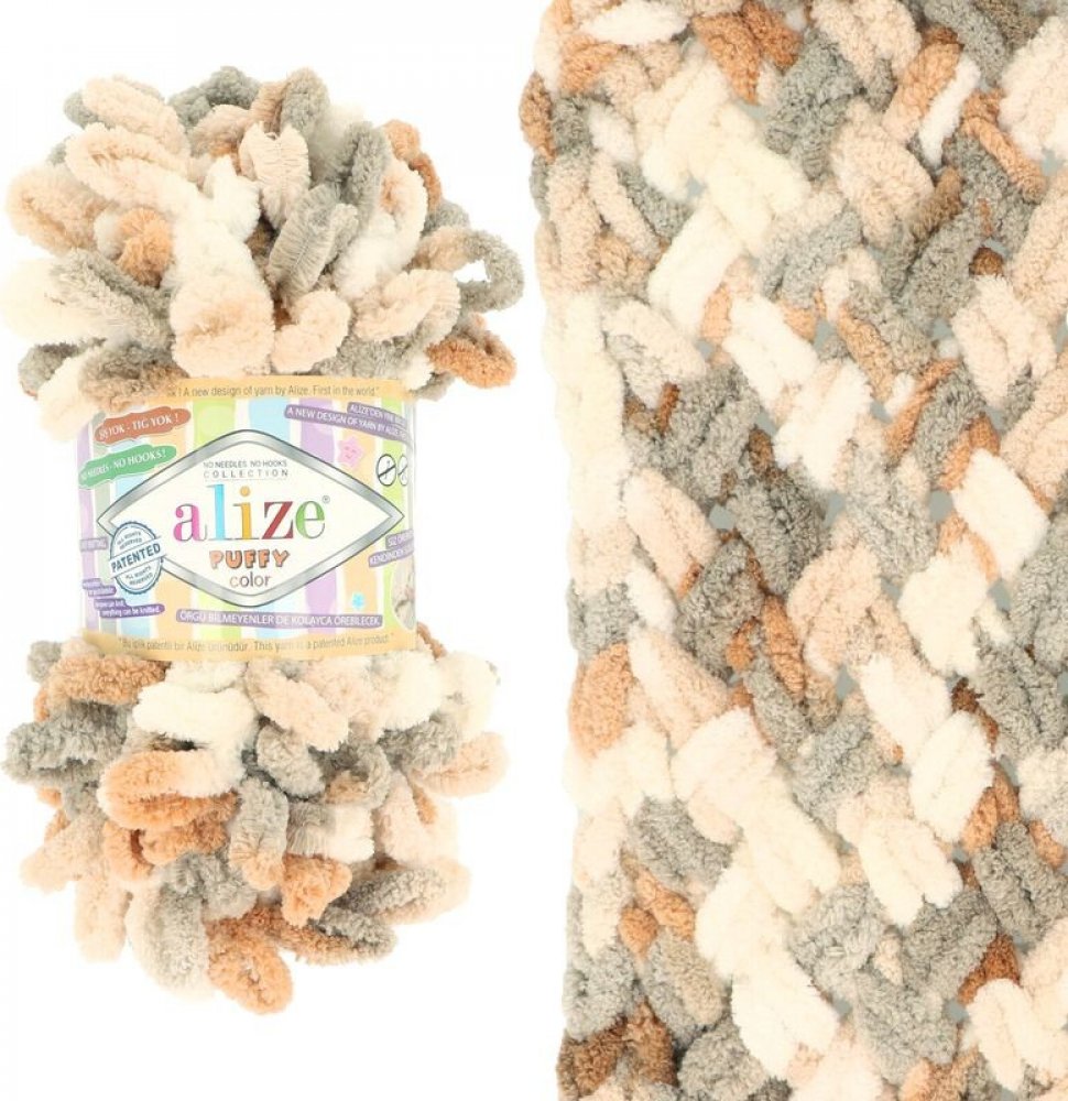 Příze s velkými oky vytváří melírovaný zrnitý barevný vzor. Směs krémové, okrové a hnědé, číslo barvy 5926.