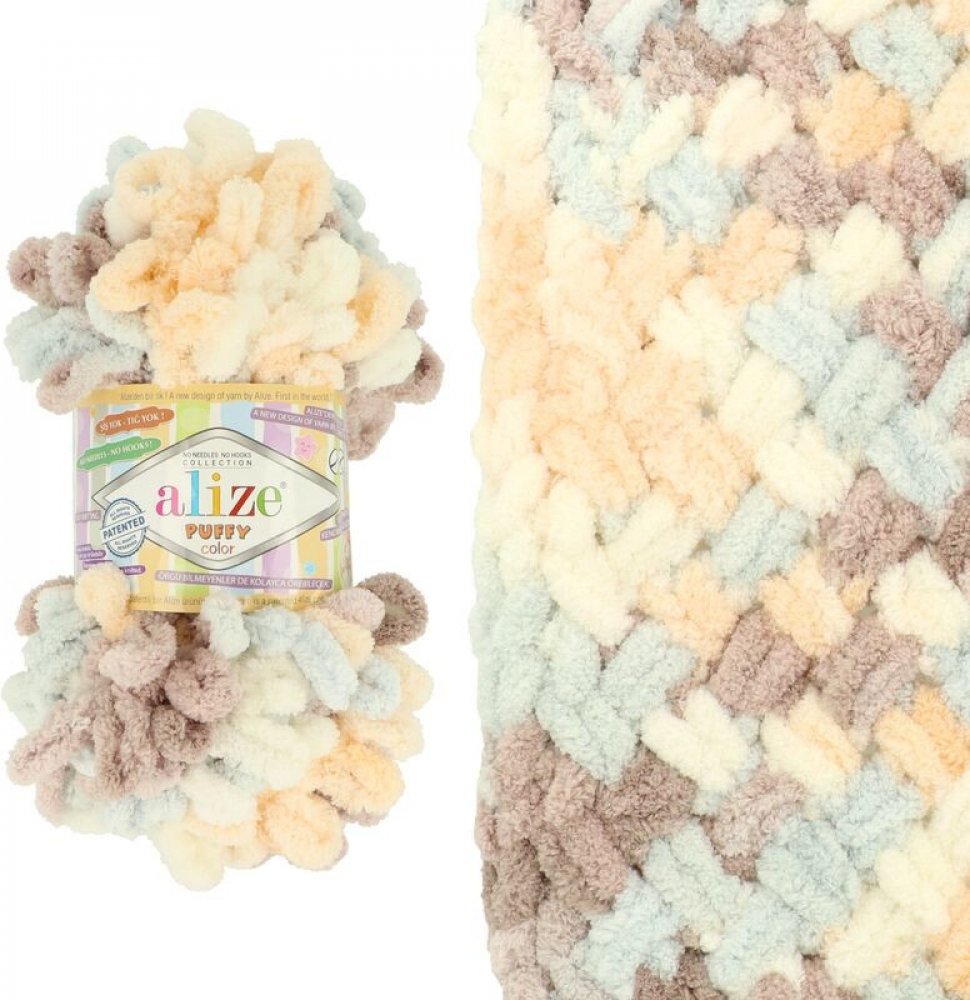 Příze s velkými oky. Směs barev šedá, meruňková, krémová, cappuccino světle hnědá. Číslo barvy 6463.