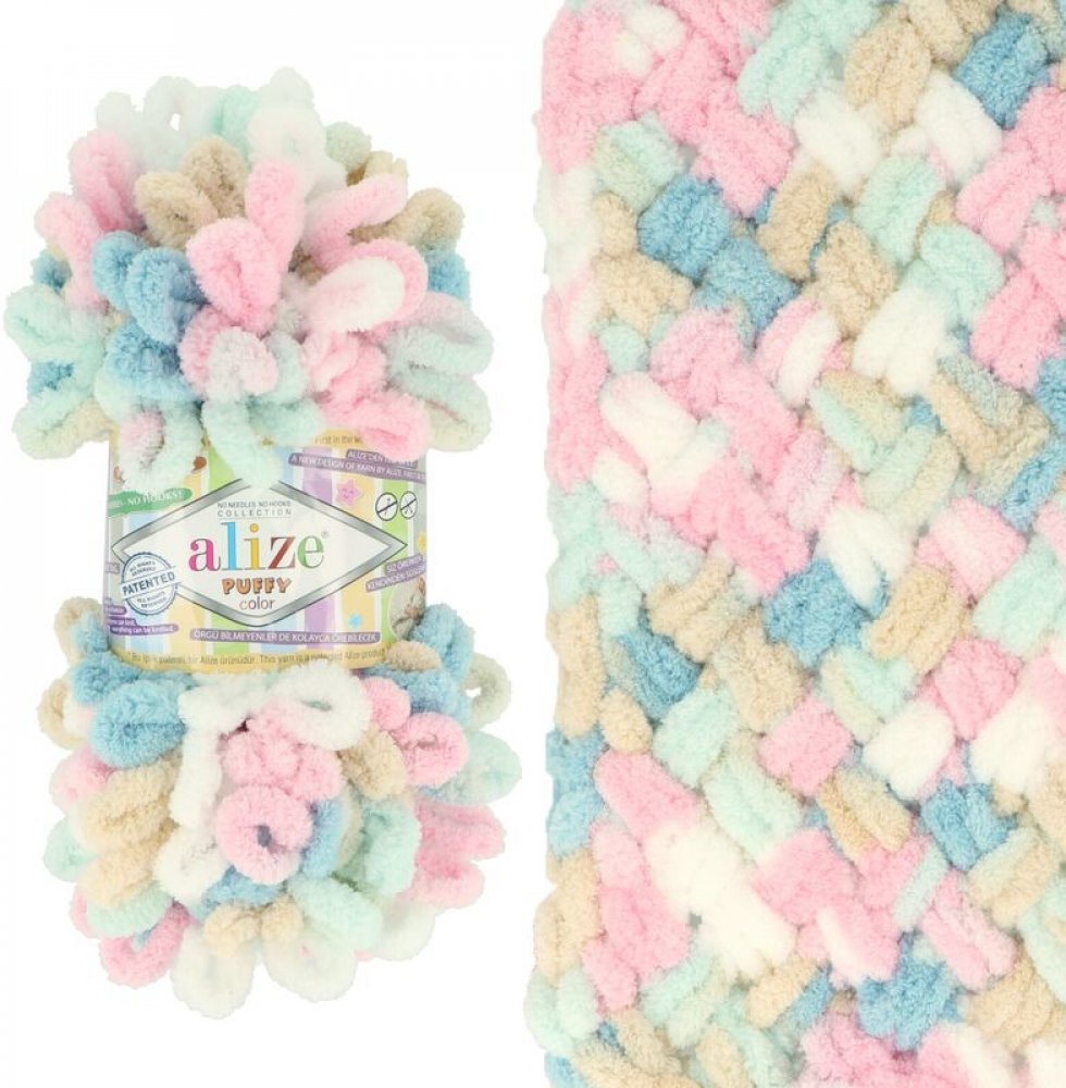 Příze s velkými oky. Směs růžové, béžové, modré a bílé, číslo barvy 6523.