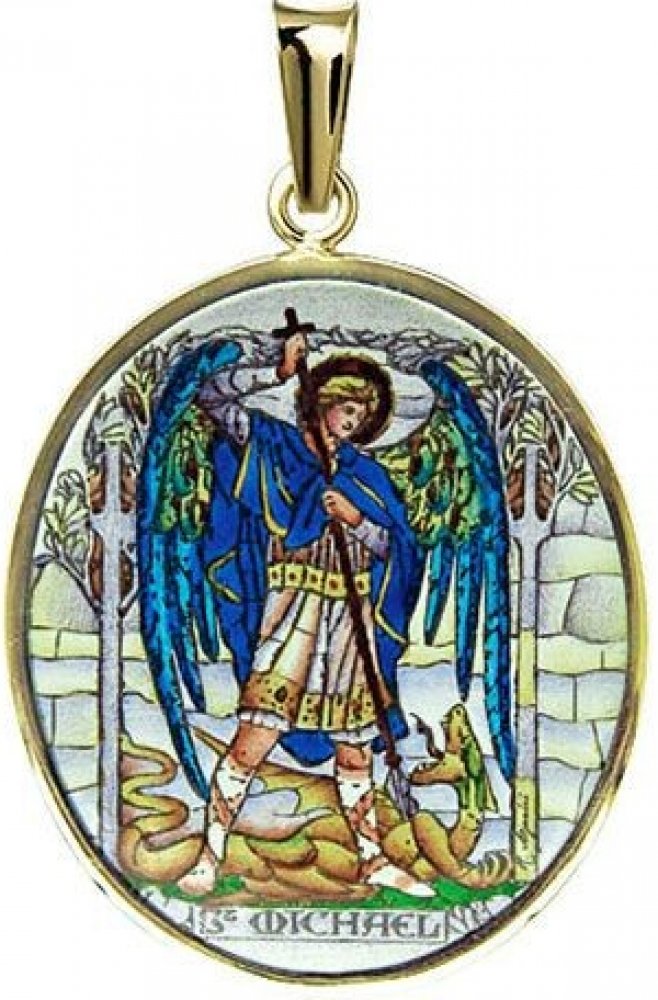 Zlatý přívěšek Archanděla Michaela, který je považován za samotného vůdce archandělů. Oděn v nebeské zbroji s ohnivým kopím přemáhající antikrista v podobě draka. Archanděl Michael je patron policistů a vojáků, je patronem obchodníků a také všech umírajících. Je ochráncem proti zlu a je považován za ztělesnění Boží spravedlnosti. Archanděl Michael nám pomáhá v těch nejtěžších situacích, zbavuje nás strachu a dodává odvahu. Jeho svátek se slaví 29. září. Jako každá madonka, která opouští naší dílnu, je i tato ručně malována. Výsledná malba je do smaltu zapálena při 700°C, povrch je dokonale lesklý. Na zářivě bílé zadní straně vyniká černý, zdobný nápis v latině “Ora pro nobis!”, který se dá do češtiny přeložit jako “Oroduj za nás!”. Šperk je vsazen do 585/1000 zlatého, ručně opracovaného rámečeku s puncem. Tento přívěšek obdržíte v dárkové krabičce s certifikátem originality v osmi jazycích, včetně češtiny. Vše již zahrnuto v ceně.