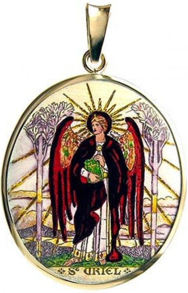 Madonka archanděl Uriel, patron moudrosti, podněcuje inspiraci, motivaci a svěží nápady. Přichází na pomoc při bouřích, povodních či požárech, protože vládne počasí. Jeho atributem bývá kniha nebo hořící meč. Jako každá madonka, která opouští naší dílnu, je i tato ručně malována. Výsledná malba je do smaltu zapálena při 700°C, povrch je dokonale lesklý. Na zářivě bílé zadní straně vyniká černý, zdobný nápis v latině “Ora pro nobis!”, který se dá do češtiny přeložit jako “Oroduj za nás!”. Šperk je vsazen do 585/1000 zlatého, ručně opracovaného rámečku s puncem. Tento přívěšek obdržíte v dárkové krabičce s certifikátem originality v osmi jazycích, včetně češtiny. Již zahrnuto v ceně.