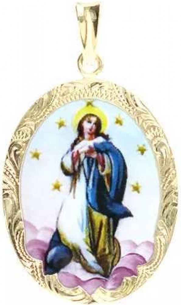 Immaculata, což je zkrácený výraz immaculata conceptio, který odkazuje na dogma o Neposkvrněném početí Panny Marie v lůně její matky (dle apokryfů svaté Anny), netýká se tedy početí Ježíše Krista. Je nazývána také Panna Marie Neposkvrněného početí nebo Bez poskvrny. Bývá zobrazována s rukama sepjatýma v modlitbě, stojící na srpku měsíce nebo na kouli, zobrazující svět. Slavnost Neposkvrněného početí Panny Marie slaví katolická církev 8. prosince. Jako každá madonka, která opouští naší dílnu, je i tato Immaculata ručně malována. Výsledná malba je do smaltu zapálena při 700°C, povrch je dokonale lesklý. Na zářivě bílé zadní straně vyniká černý, zdobný nápis “Svatá Maria matko Boží oroduj za nás”. Medailon Immaculata je vsazen do 585/1000 zlatého, ručně opracovaného rámečeku s puncem. Tento přívěšek obdržíte v dárkové krabičce s certifikátem originality v osmi jazycích, včetně češtiny. Již zahrnuto v ceně. Tento medailonek jsme původně vytvořili na přání zákazníka, nosit věrnou kopii madonky Moniky Absolonové.