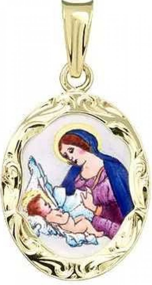 Jako každá madonka, která opouští naší dílnu, je i tato Madona s dítětem ručně malována. Výsledná malba je do smaltu zapálena při 700°C, povrch je dokonale lesklý. Na zářivě bílé zadní straně vyniká černý, zdobný nápis “Svatá Maria matko Boží oroduj za nás”. Gravírovaný medailon Madona s dítětem je vsazen do 585/1000 zlatého, ručně opracovaného rámečku s puncem. Tento přívěšek obdržíte v dárkové k...