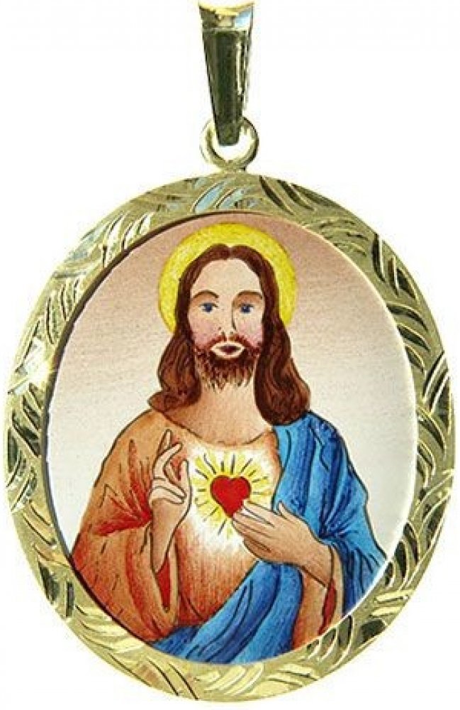 Ručně malovaný medailon Nejsvětějšího srdce Ježíšovo modré podtrhuje opravdové lidství Božího Syna Ježíše Krista. Slavnostmi Nejsvětějšího srdce Ježíšova si toto připomínáme 19. června. Jako každá madonka, která opouští naší dílnu, je i tato ručně malována. Výsledná malba je do smaltu zapálena při 700°C, povrch je dokonale lesklý. Na zářivě bílé zadní straně vyniká černý, zdobný nápis v latině “Ora pro nobis!”, který se dá do češtiny přeložit jako “Oroduj za nás!”. Šperk je vsazen do 585/1000 zlatého, ručně opracovaného rámečku s puncem. Tento přívěšek obdržíte v dárkové krabičce s certifikátem originality v osmi jazycích, včetně češtiny. Již zahrnuto v ceně.