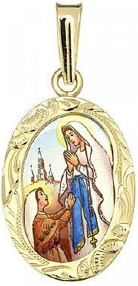 Medailon Sv. Bernadety Lurdské, patronky pastýřů a pomocnice nemocných. Jejími atributy jsou: růženec a Panna Maria v lurdské jeskyni. Připomínku Svaté Bernadety slavíme 16. dubna. Ručně malováno. Malba je do smaltu vpálena při 700°C, povrch je lesklý a zadní straně vévodí zdobný nápis “Svatá Maria matko Boží oroduj za nás”. Vše je zasazeno do 585/1000 zlatého, ručně opracovaného rámečku s puncem. Přívěšek obdržíte v dárkové krabičce s certifikátem originality v osmi jazycích, včetně češtiny. Již zahrnuto v ceně.