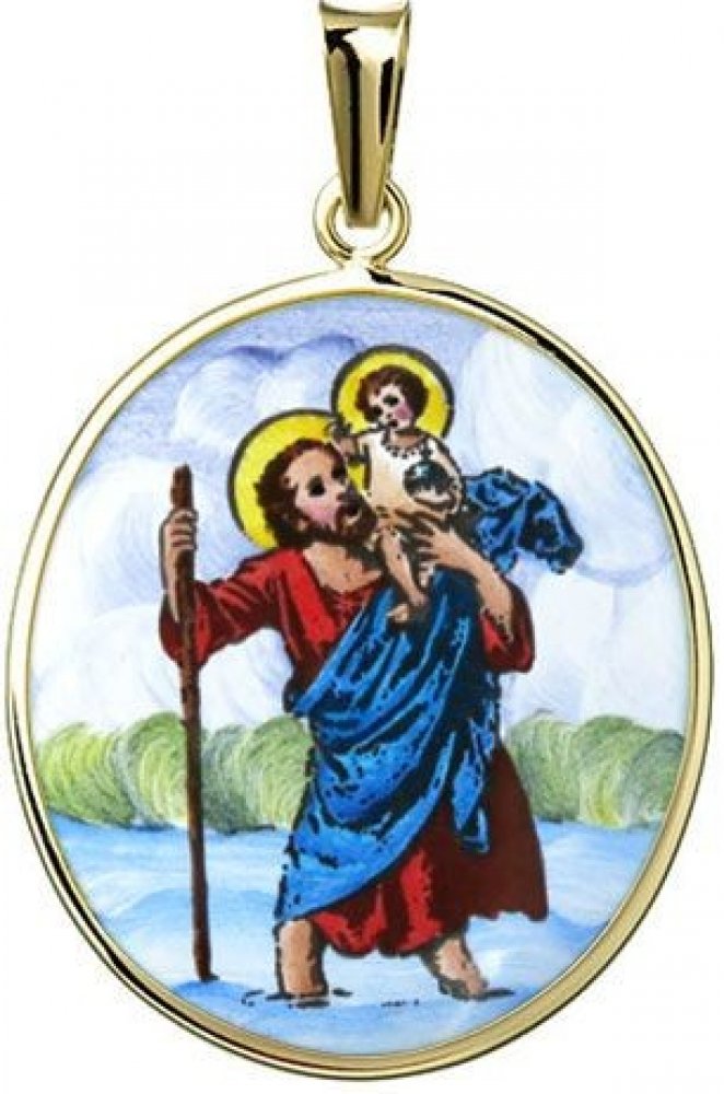 Madonka sv. Kryštofa, patrona všech poutníků, motoristů a cestujících. Též letců, lodníků, námořníků a řidičů, štěstí přináší i obchodníkům. Je to patron atletů, lékařů, ochránce horníků i tesařů. Je vzýván jako pomocník v nouzi. Jeho atributy jsou: dítě Ježíš, hůl (většinou zelenající se), eventuelně stromek, širší vodní tok. Je mužem obrovité postavy, poustevník. Jeho svátek slavíme 25. července. Jako každá madonka, která opouští naší dílnu, je i tato ručně malována. Výsledná malba je do smaltu zapálena při 700°C, povrch je dokonale lesklý. Na zářivě bílé zadní straně vyniká černý, zdobný nápis v latině “Ora pro nobis!”, který se dá do češtiny přeložit jako “Oroduj za nás!”. Šperk je vsazen do 585/1000 zlatého, ručně opracovaného rámečku s puncem. Tento přívěšek obdržíte v dárkové krabičce s certifikátem originality v osmi jazycích, včetně češtiny. Již zahrnuto v ceně.