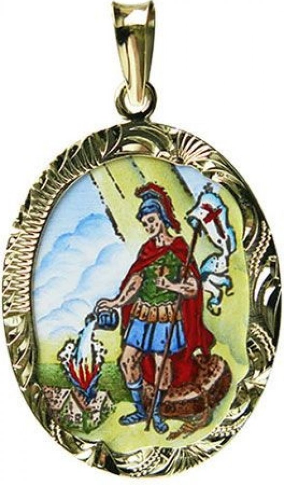 Medailon Svatého Floriána z Lorchu, patrona profesí souvisejících s ohněm. Je patronem hasičů, kovářů, pekařů či kominíků. Vzýván je jako ochránce proti suchu, ohni, povodním a neúrodě. Atributy Svatého Floriána z Lorchu jsou: brnění, dům, korouhev, oheň, praporec na kopí, vědro, voda. Svátek slavíme 4. května. Jako každá madonka, která opouští naší dílnu, je i tato ručně malována. Výsledná malba je do smaltu zapálena při 700°C, povrch je dokonale lesklý. Na zářivě bílé zadní straně vyniká černý, zdobný nápis “Svatý Floriáne ochraňuj mne!”. Šperk je vsazen do 585/1000 zlatého, ručně opracovaného rámečku s puncem. Tento přívěšek obdržíte v dárkové krabičce s certifikátem originality v osmi jazycích, včetně češtiny. Vše již zahrnuto v ceně.