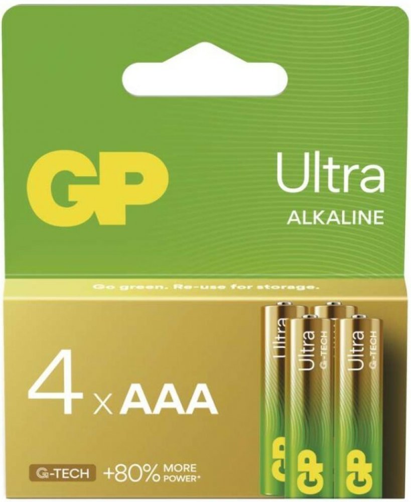 chemické složení: alkalické|hmotnost: 11,5 g|kapacita: neuvádí se|kategorie/řada: Ultra Alkaline|max. skladovatelnost: 10 let|možnost nabíjení: ne|napětí: 1,5 V|počet nabíjecích cyklů: nenabíjecí|prodejní obal: 4 ks, papírová krabička|provozní teplota: -18 °C až +50 °C|rozměr: 10,5 × 44,5 mm|typ: LR03 (mikrotužka, AAA)|velikost baterie: AAA|značka: GP