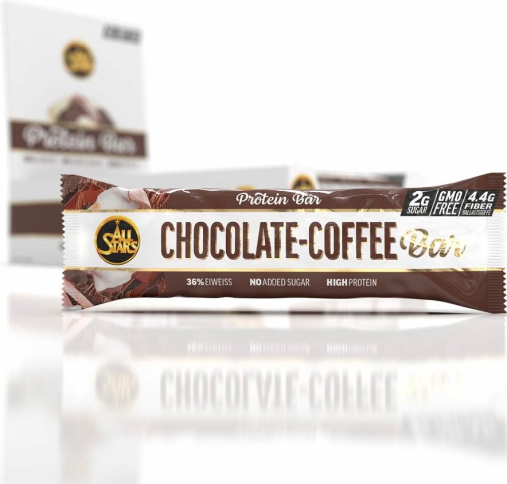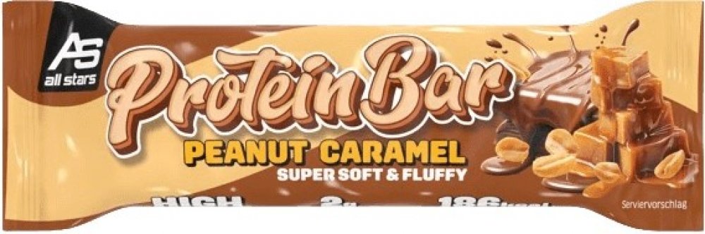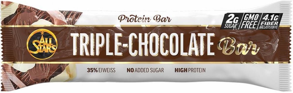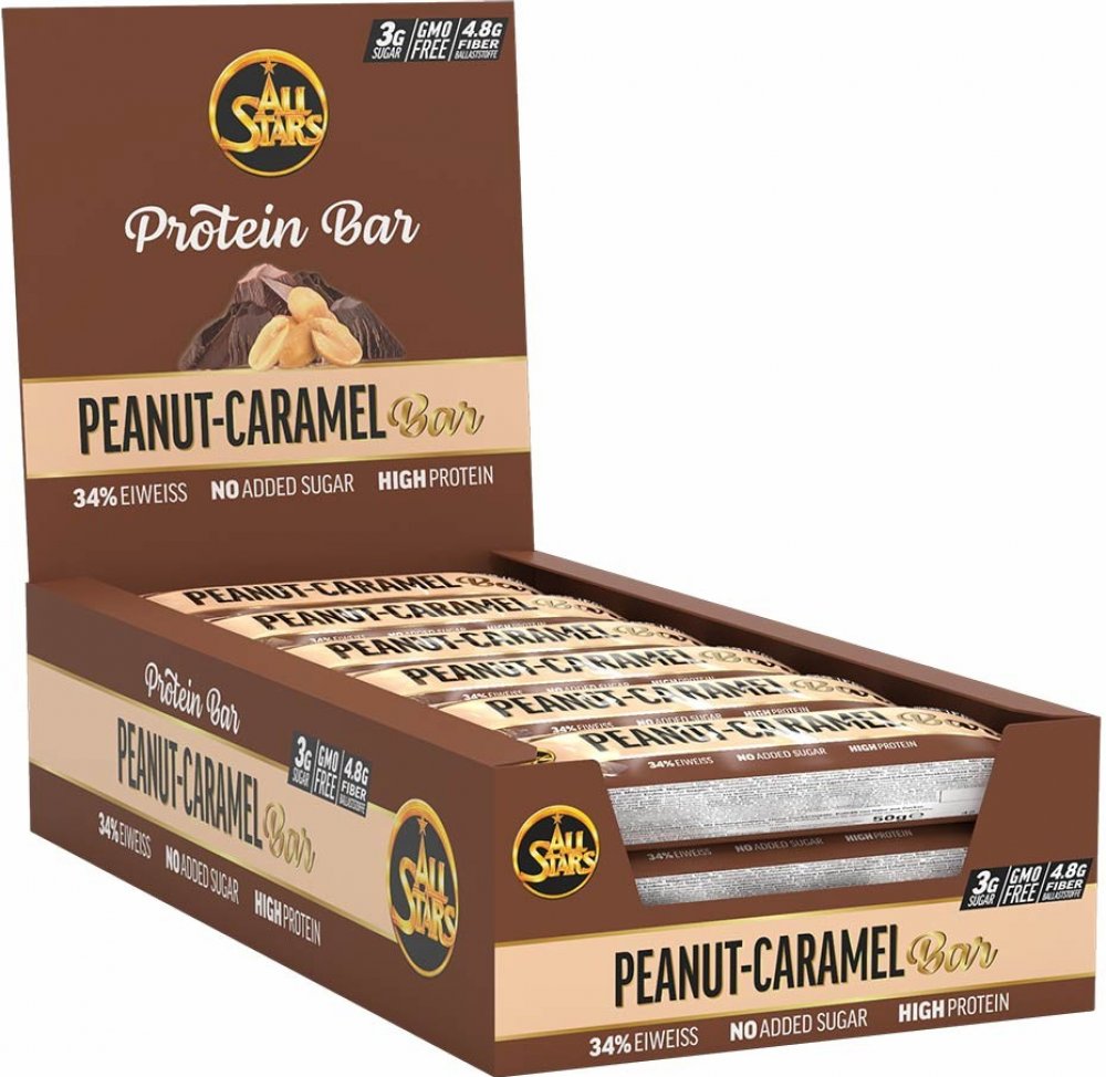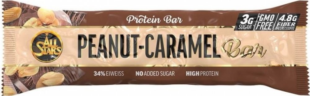 All Stars Protein Bar je chutná proteinová tyčinka dostupná ve 2 verzích - Peanut-Caramel Bar a Triple-Chocolate Bar. Tyčinka Peanut-Caramel obsahuje skutečné arašídy a je politá lahodnou mléčnou čokoládou. Triple-Chocolate je zase obohacena o lahodné kakaové lupínky a je politá lahodnou bílou čokoládou. Díky nízkému obsahu cukru si můžeš dopřát tento chutný snack kdykoliv a kdekoliv a to zcela bez výčitek. Jedna tyčinka obsahuje pouze 2,3 g cukru a až 16,9 g kvalitních bílkovin, které přispívají k růstu a udržení svalové hmoty. Má nízký obsah cukru a je vynikajícím zdrojem vlákniny.