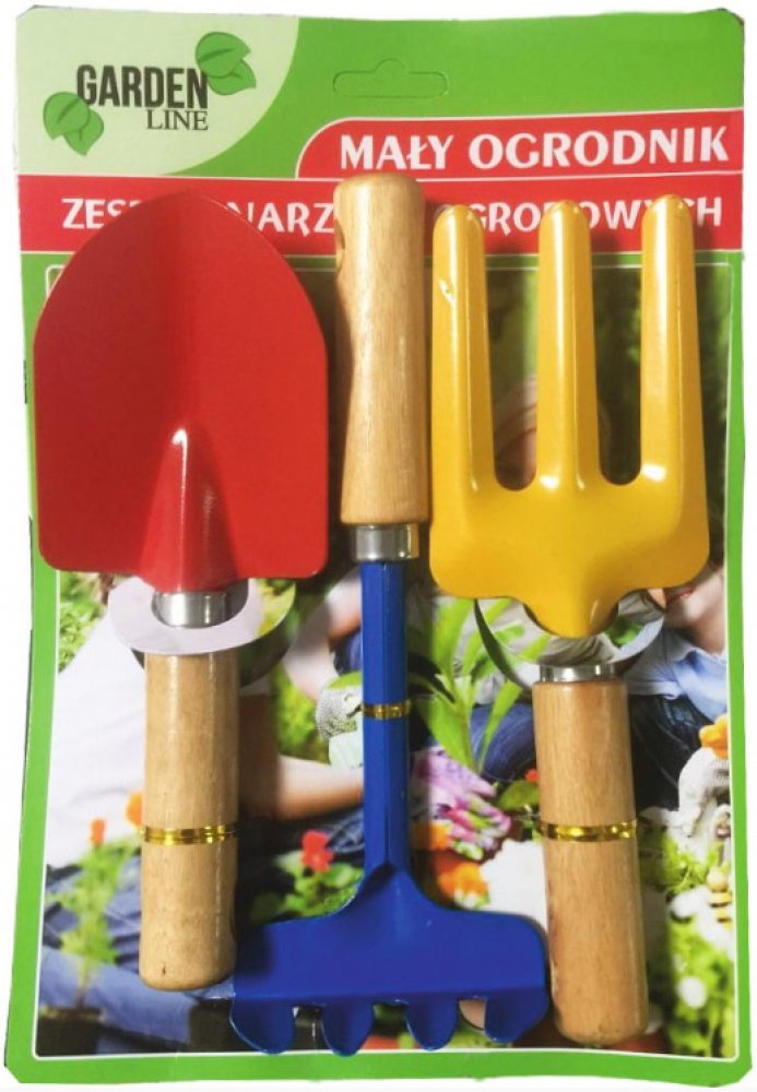 Sada obsahuje celkem tři kusy zahradnického nářadí, jedná se o lopatku, hrábě a malé vidle.