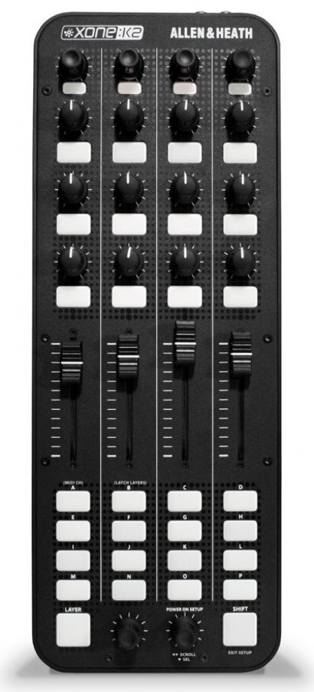 Allen&Heath XONE:K2 • MIDI kontrolér, 4 kanálová zvuková karta • USB (napájení, přenos audio/MIDI) • X-Link pro spojení dvou K2 nebo s DB2, DB4 • 52 fyzických ovladačů ve třech vrstvách (až 171 MIDI zpráv) • hlavní výstup RCA, sluchátkový výstup 3,5mm Jack • přepravní pouzdro součástí balení • rozměry 358x135x30 (mm) • hmotnost 1 kg