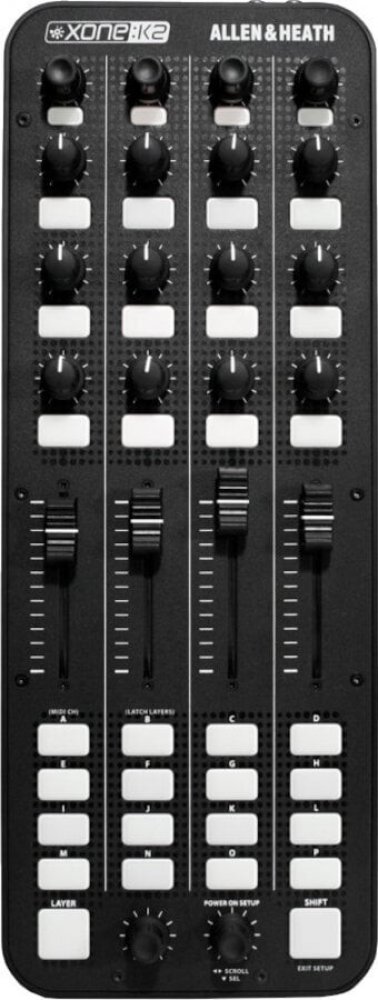 XONE:K2 je USB MIDI kontrolér a 4 kanálová zvuková karta. Plně konfigurovatelné MIDI rozhraní s tří barevnými LED a napájením z USB (případně X-Link). K2 navíc obsahuje rozhraní Allen&Heath X-Link pro propojení s XONE produkty. K2 je navrženo pro spolupráci s jakoukoliv DAW/DJ aplikací, která podporuje MIDI (jako je např. Ableton, Traktor Pro, Serato Scratch atp.). K2 nabízí 52 fyzických ovládacích prvků, 12 otočných potenciometrů, 6 otočných enkodérů s tlačítkem, 4 lineární tahové potenciometry a 30 podsvětlených tlačítek. Ve třech vrstvách je tedy dostupných až 171 MIDI příkazů. Otevřená achitektura K2 umožňuje úplné uživatelské nastavení. K2 také obsahuje 4 kanálovou zvukovou kartu, která muže pracovat v rozlišení vzorkovací frekvence 44,1 a 48kHz. 2 stereo kanály směřují z PC/Mac do K2 tak, že jeden kanál jde do sluchátkového výstupu a druhý na hlavní L+R výstup. To umožní sluchátkový odposlech bez přerušení hlavního výstupu. Hlavní výstup je osazen RCA konektory a sluchátkový výstup je realizován prostřednictvím konektoru 3,5mm stereo Jack. Díky X-Link protokolu lze spojit dvě jednotky K2 a zdvojnásobit tak počet ovládacích prvků K2. X-Link používá standardní RJ45 konektor a přenáší data i napájení, to znamená že spojení s DAW je realizováno pouze jedním USB kabelem. Konstrukce K2 je z robustního plastu a ocelového čelního panelu. Potenciometry jsou připevněny kovovými maticemi k čelnímu panelu. Součástí balení je speciální přepravní pouzdro, které může sloužit i jako podstavec/podložka pro K2.