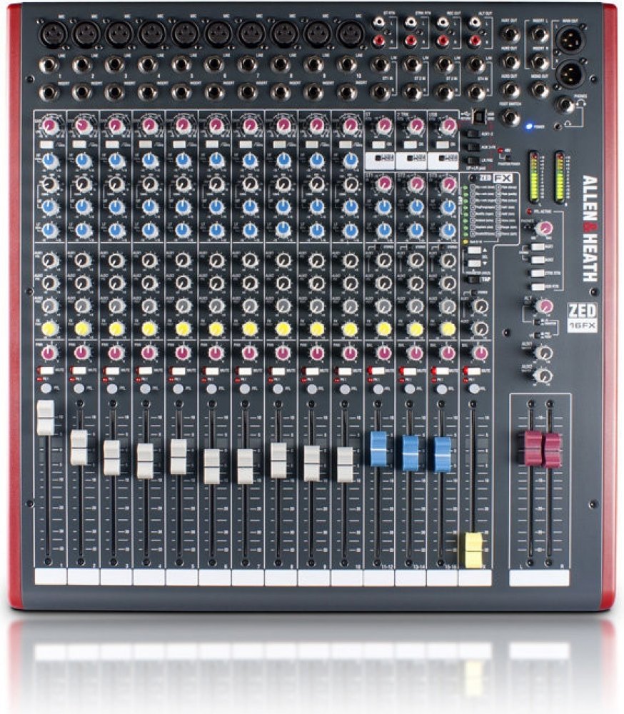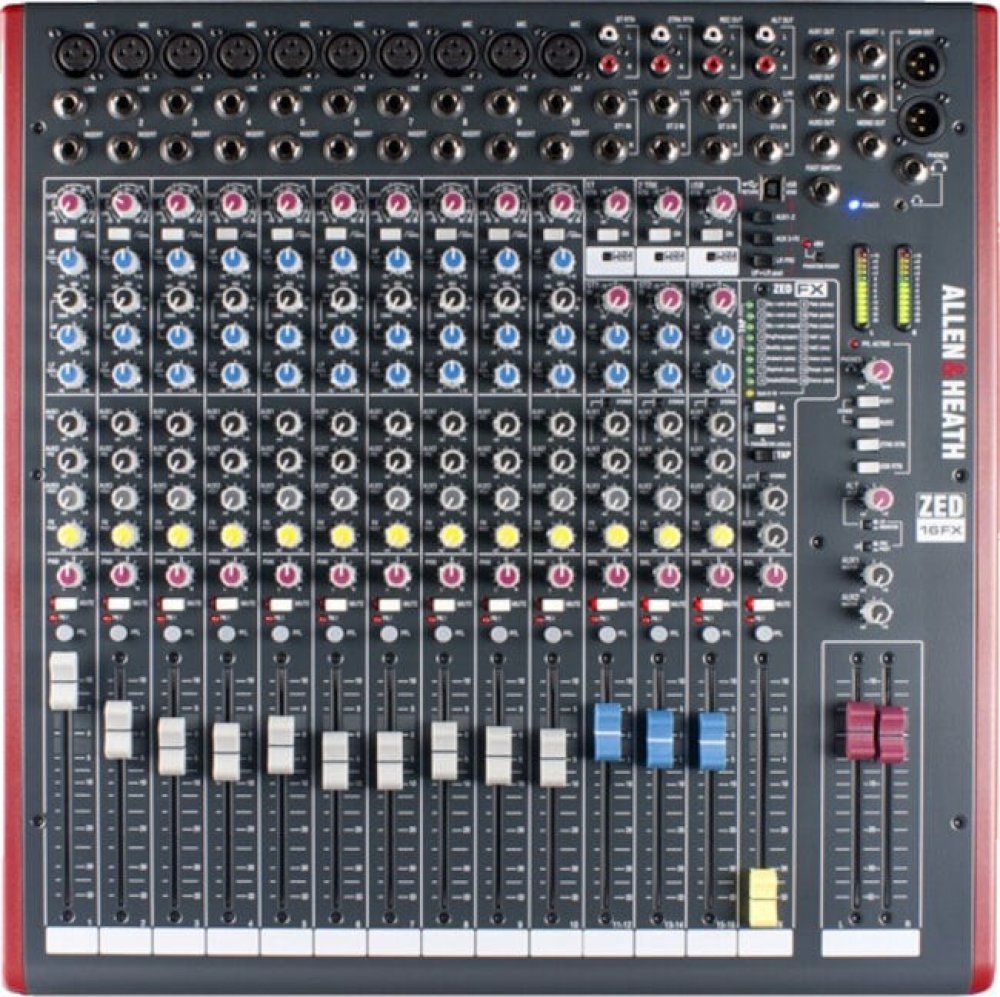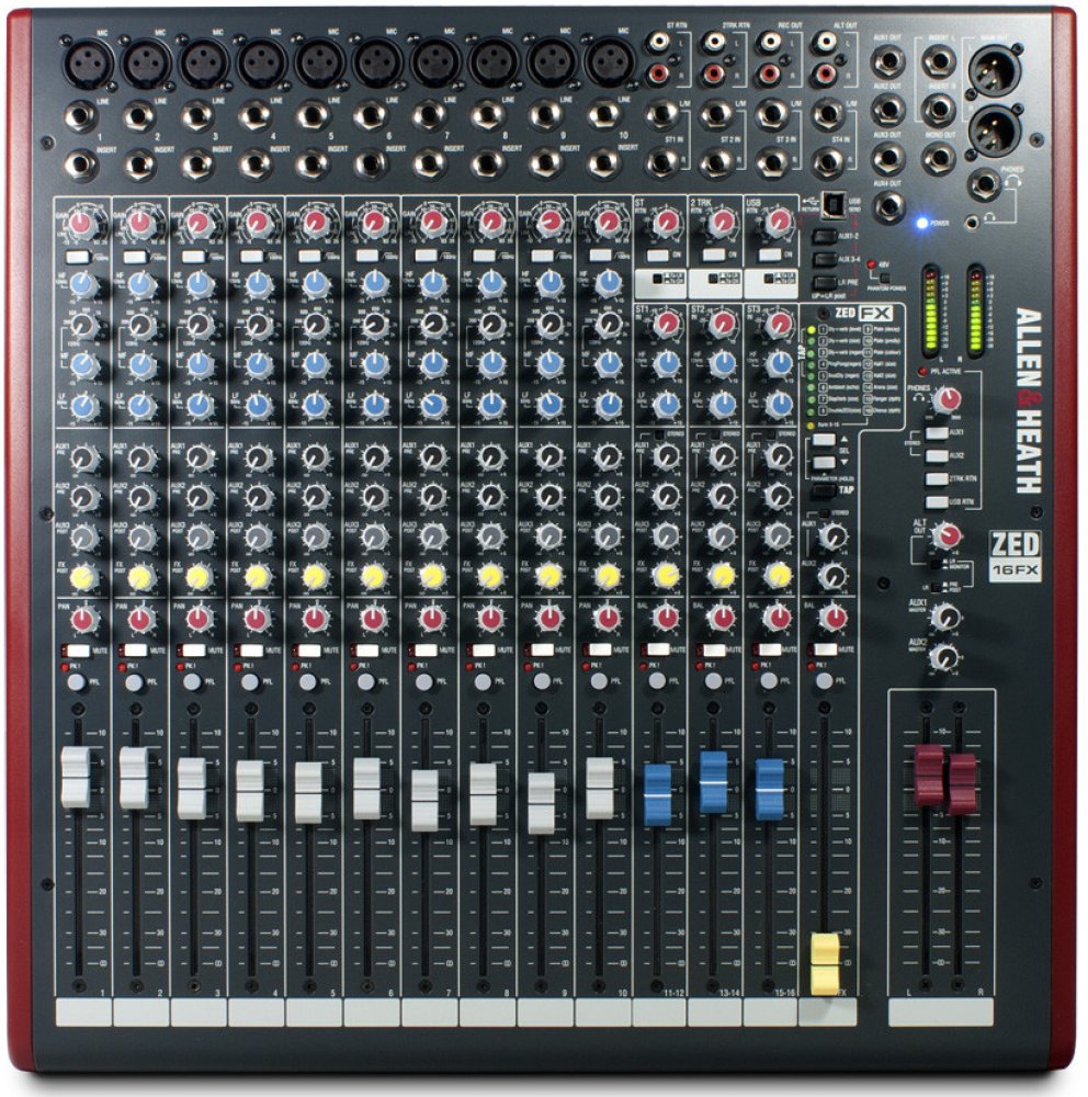 ZED 16FX je více účelový, kompaktní mixážní pult pro nahrávání a živé zvučení, který nabízí 10 mono kanálů, tři duální stereo kanály a kvalitní efektovou jednotku. ZED 16FX lze instalovat do standardního 19" racku.Všechny mono kanály obsahují předzesilovače Allen & Heath DuoPre, třípásmový ekvalizér MusiQ s laditelnou střední frekvencí, 3 pomocné sběrnice AUX, 100mm tahové poteniometry ALPS. Navíc ZED 16FX obsahuje USB rozhrani, které umožní využít mix pro stereo nahrávání nebo přidaní softwareových efektových pluginů do mixu. Otočné ovladače jsou bezpečne uchyceny do čelního panelu pomocí kovových matic. ZED 16FX obsahuje vysoce kvalitní komponenty NEUTRIK (konektory XLR a Jack)