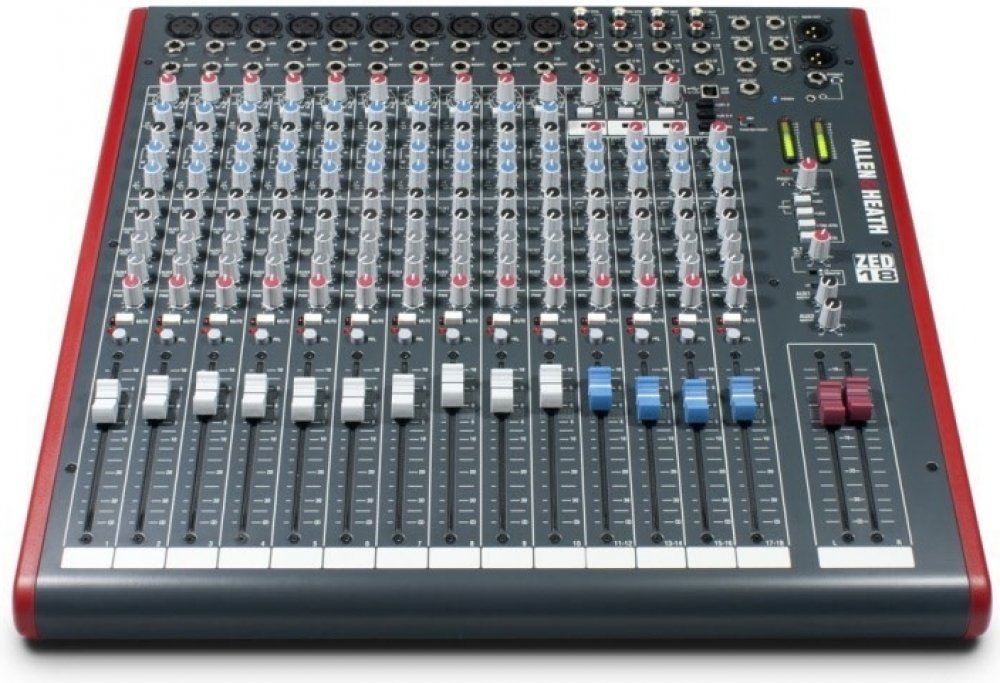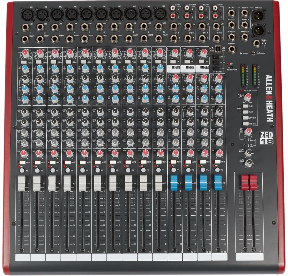 ZED 18 je multifunkční mixážní pult ideální pro nahrávání a živé zvučení, který nabízí 10 mono a 4 stereo kanály v komaktním formátu s možností montáže do racku. ZED 18 je konstruován pro hudební skupiny, školy, multimediální a ozvučovací společnosti, které hledají maximální užitnou hodnotu kompaktního mixážního pultu. Všechny mono kanály jsou vybaveny předzesilovači Allen & Heath DuoPre, třípásmovým ekvalizérem MusiQ s laditelnou střední frekvencí, čtyřmi pomocnými sběrnicemi AUX a 100mm ALPS fadery. ZED 18 navíc obsahuje USB rozhraní, které umožní využít mix pro stereo nahrávání nebo přidaní softwareových efektových pluginů do mixu. Otočné ovladače jsou bezpečně uchyceny do čelního panelu pomocí kovových matic. ZED 18 obsahuje vysoce kvalitní komponenty NEUTRIK (konektory XLR a Jack).