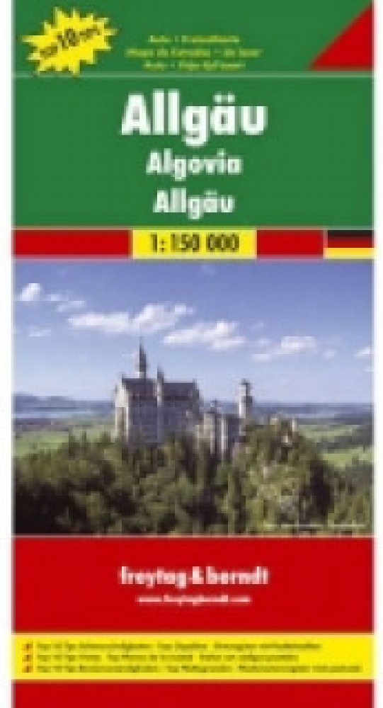 Jednostranná regionální automapa regionu Allgau. Mapa s bohatým turistickým obsahem je svým měřítkem vhodná pro poznávání regionu autem či na kole. Silniční síť je označena čísly komunikací, symbolické znaky pro benzínové stanice, odpočívadla, motely, kilometráž, uzavřené úseky. Vedle dopravních informací jsou zaznačeny přírodní rezervace, panoramatické cesty s krásnou vyhlídkou, turistické značen...