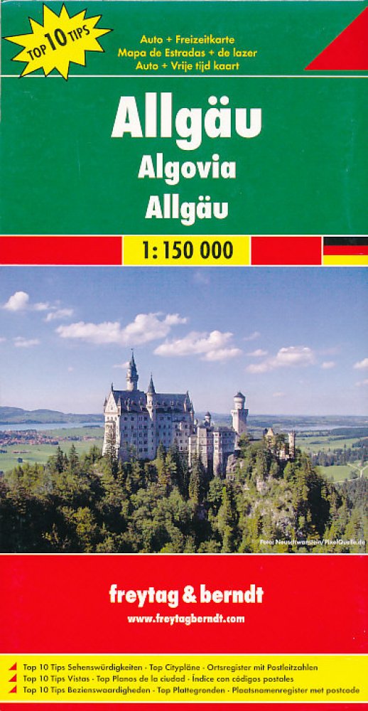Jednostranná regionální automapa regionu Allgau. Mapa s bohatým turistickým obsahem je svým měřítkem vhodná pro poznávání regionu autem či na kole. Silniční síť je označena čísly komunikací, symbolické znaky pro benzínové stanice, odpočívadla, motely, kilometráž, uzavřené úseky. Vedle dopravních informací jsou zaznačeny přírodní rezervace, panoramatické cesty s krásnou vyhlídkou, turistické značené trasy, cyklotrasy, kulturní zajímavosti, znaky pro tábořiště, kempy. Turistické cíle jsou doplněné o hvězdičkové hodnocení zajímavosti (podobně jako v průvodcích). Výškopis je v mapě vyznačen pomocí stínování. Přiložená brožura s rejstříkem sídel, popisem 10 turistických cílů a s plány 6 největších měst regionu. Česká legenda. Vydání: Z důvodu časté aktualizace map Vám dotaz na rok vydání rádi zodpovíme telefonicky či emailem. Děkujeme za pochopení.