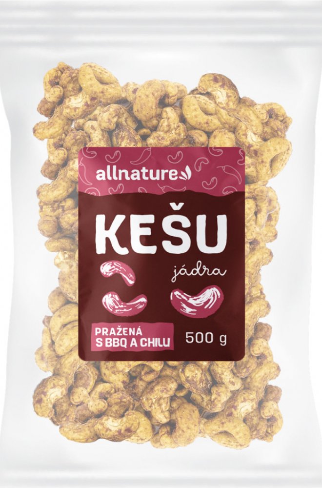 Ochutnejte oblíbené kešu ořechy, tentokrát v kombinace s BBQ a chilli. Vhodné jako rychlá svačinka nebo jen tak na mlsání. Složení: Kešu jádra W320 93,5 %, hnědý cukr 2,55 %, BBQ bylinky (sůl, uzená paprika, česnek, mletý černý pepř, cibule prášek, drcené oregáno, mleté chilli), sůl, cizrnová mouka. Upozornění:Alergeny: Kešu. Může obsahovat stopy lepku, sóji, sezamu, arašídů a dalších skořápkových plodů. Obsah:500 g Výrobce:Allnature s.r.o., Březhradská 148, 503 32 Hradec Králové, Česká republika. Výživové údaje na 100 g: Energetická hodnota 2438 kJ/587 kcal Tuky- z toho nasycené mastné kyseliny 43,6 g8,7 g Sacharidy- z toho cukry 32,3 g7,4 g Bílkoviny 14,7 g Sůl 1,63 g