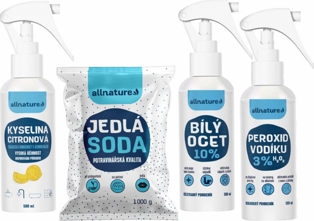 Zvýhodněný starter pack čtyř osvědčených přeborníků - jedlé sody (1 kg), roztoku kyseliny citronové (500 ml), bílého octa 10% (500 ml) a peroxidu vodíku 3% (500 ml), se kterými hravě proniknete do tajů šetrného úklidu. Tito všestranní a univerzální pomocníci spolehlivě nahradí celou řadu specializovaných čističů a obstarají úklid celé domácnosti.