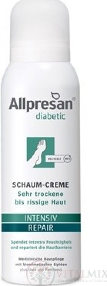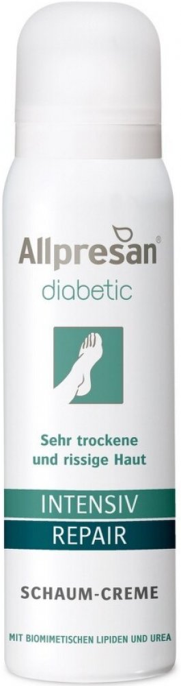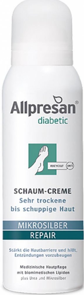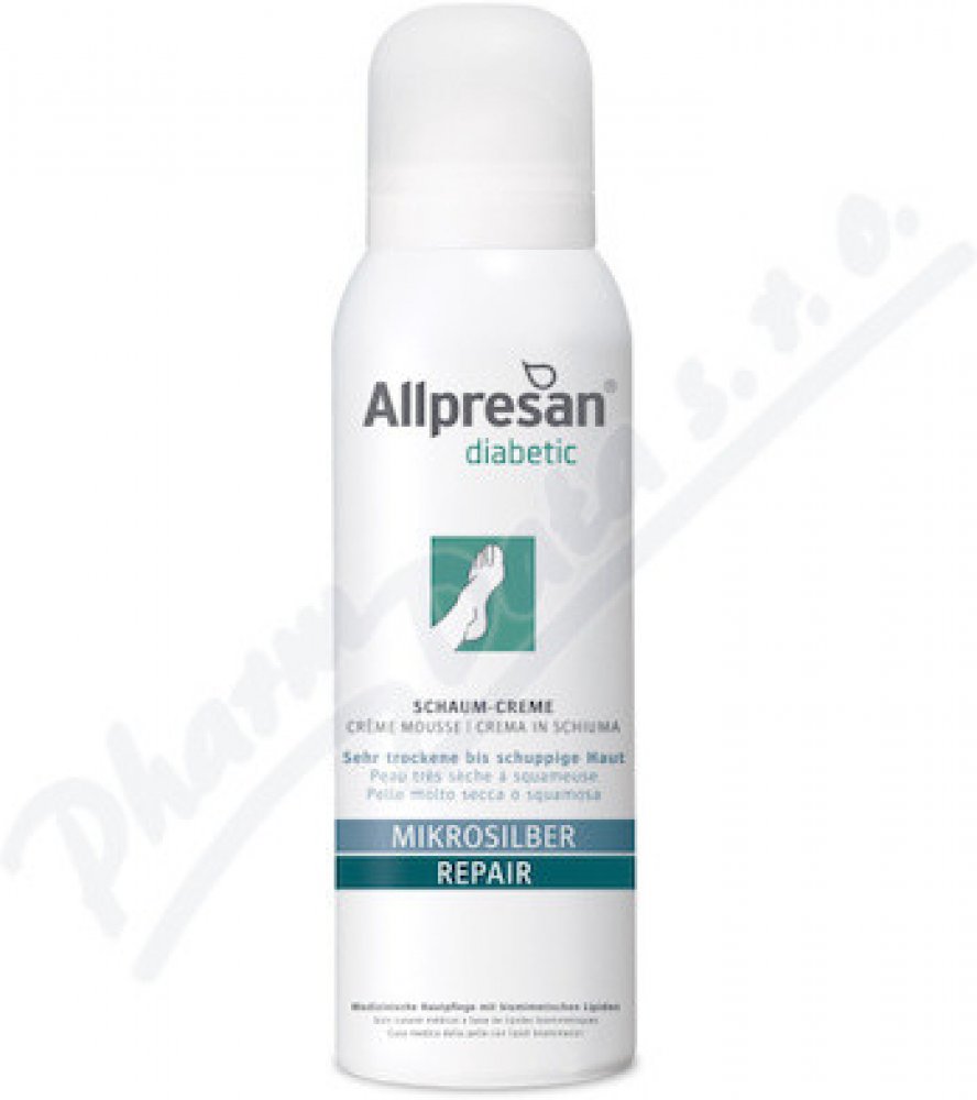 Velmi suchá až šupinatá kůže je častým vedlejším projevem cukrovky. Studie prokázaly, že kožní bariéra je u diabetiků narušena a to může být často výchozím bodem pro rozvoj závažných komplikací nohou. Při narušení kožní bariéry se výrazně zvyšuje riziko průniku choroboplodných zárodků a mikroorganismů a z toho plynoucích sekundárních infekcí. Allpresan diabetic microsilver + repair pěnový krém byl vyvinut speciálně pro péči o pokožku s diabetes mellitus. Díky biomimetickým (kožním) lipidům a uree je kožní bariéra posílena a intenzivně hydratována. Mikrostříbro má antibakteriální vlastnosti a pomáhá předcházet zánětům.