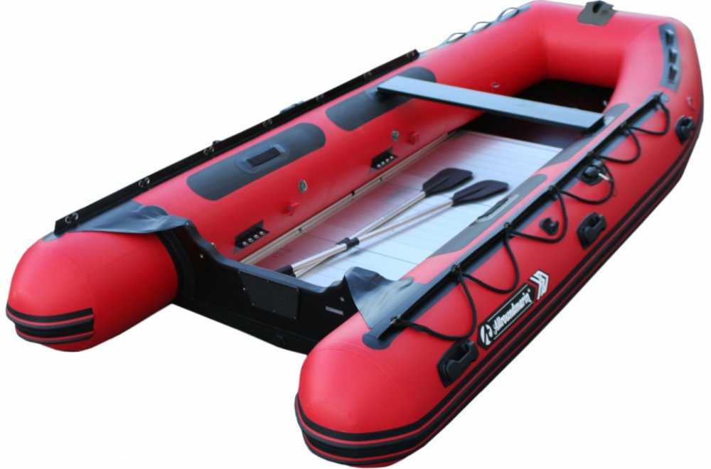 Pevný a prostorný nafukovací člun s hliníkovou podlahou a nafukovacím V - kýlem. Příslušenství: pumpa, vesla, 2 sedací lavice, úchyty na nošení, úchyty vesel, vlečné kruhy, vyvazovací lano, obvodové lano, skládací hliníková podlaha, opravárenská sada, přenosná taška. Specifikace: Celková délka - 379 cm, Celková šířka - 173 cm, Průměr tuby - 45 cm, Vzduchové komory: 3 + 1, Hmotnost - 69 kg, Nosnost - 780 kg, Počet osob - 5, Maximální výkon - 25 HP / 18, 7 kW, Max. hmotnost motoru - 83 kg, výška zrcadla - 38 cm. Závěsný motor není součástí člunu!