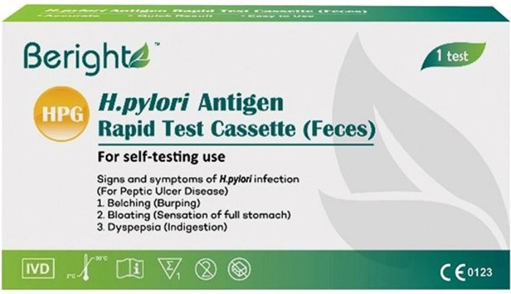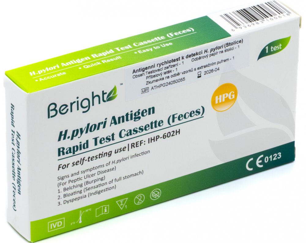 Rychlý spolehlivý test na detekci antigenu Helicobacteru Pylori ve vzorcích lidské stolice. Způsob testu: Ze stolice Počet kusů v balení: 1 Typ balení testů: Jednotlivě SADA OBSAHUJE1x Zkušební zařízení1x Zkumavka s roztokem + odběrové zařízení1x Odběrový papír na zachycení stolice1x Příbalový leták KOMPLETNÍ INFORMACE NALEZNETE V PŘÍBALOVÉM LETÁKU.Toto zboží nelze z hygienických důvodů vrátit...