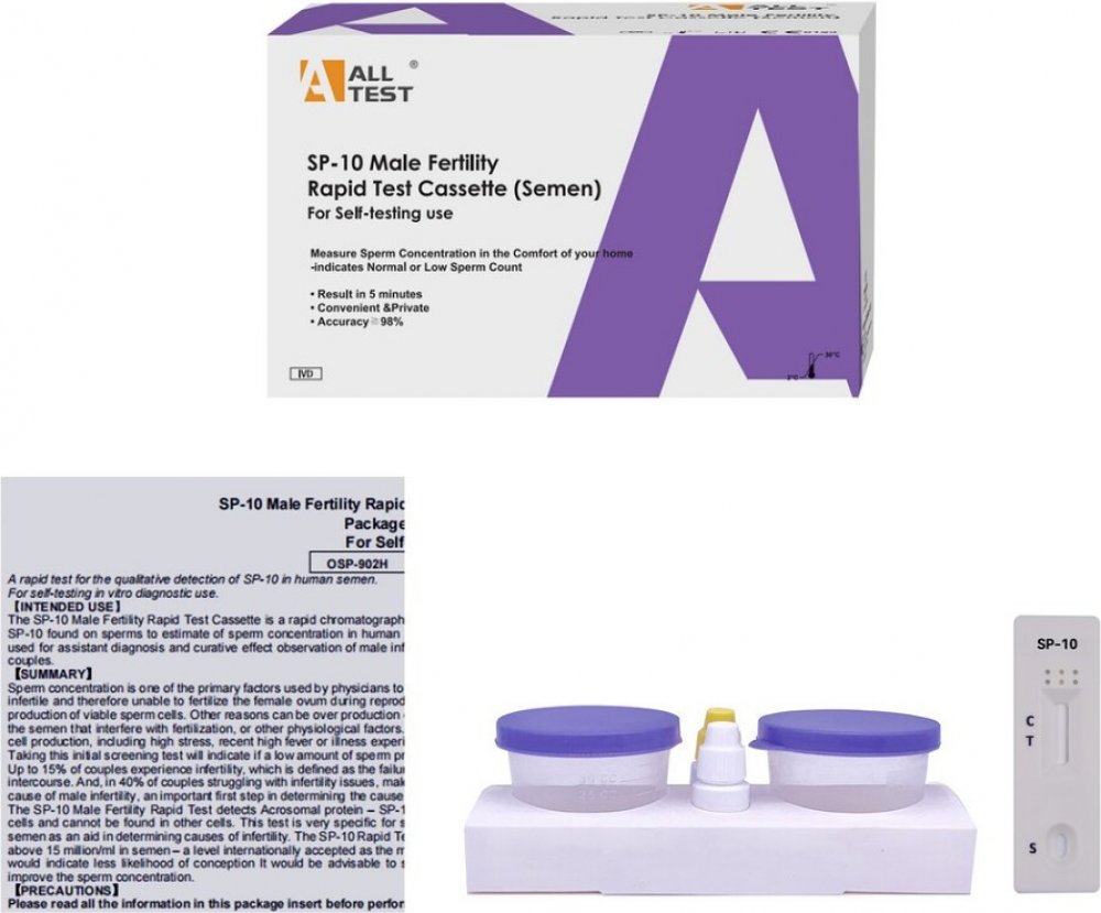 AllTest SP-10 Test mužské plodnosti Test pro spolehlivou detekci počtu mužských spermií. Určeno pro samotestování. Odběr ze spermatu. Mužská neplodnost je nejčastěji způsobena problémy spojenými s kvalitou spermatu, počtem spermií a pohyblivostí spermií.