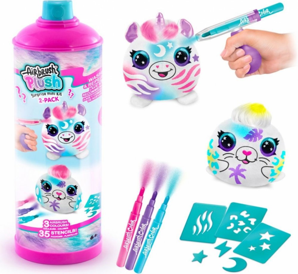 Airbrush kreativní sada Mini Překvapení 2 pack ve tvaru spreje skvěle zabaví každého. Uvnitř balení najdete dva plyšáky o velikosti 10 cm, airbrush nástroj, 3 fixy a 35 šablon, se kterými můžete plyšáky vyzdobit podle své fantazie. Když vás design omrzí, stačí plyšáky vyprat dle návodu a po uschnutí můžete znovu tvořit.