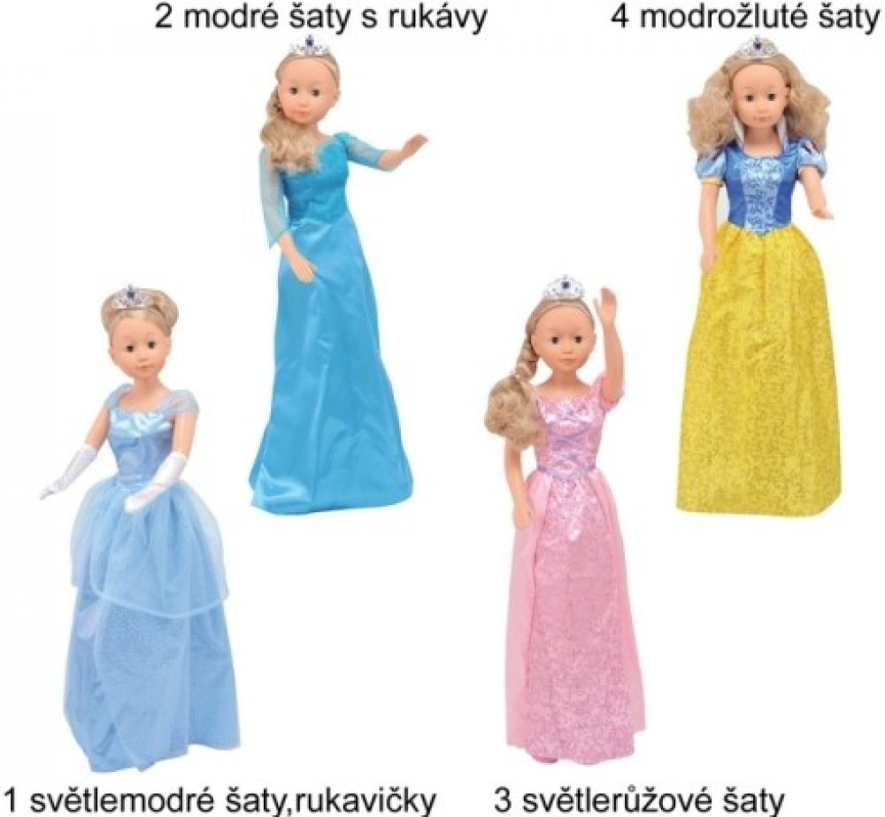 Panenka Bambolina Molly princezna se bude líbit každé holčičce. Krásná panenka je oblečená v nádherných šatech. Výška panenky je asi 99 cm. Rozměry balení: cca 34 x 99 x 15 cm Věk: 3+ Cena je za 1 ks. Varianty zboží: 1 světlemodré šaty, rukavičky 2 modré šaty s rukávy 3 světlerůžové šaty 4 modrožluté šaty