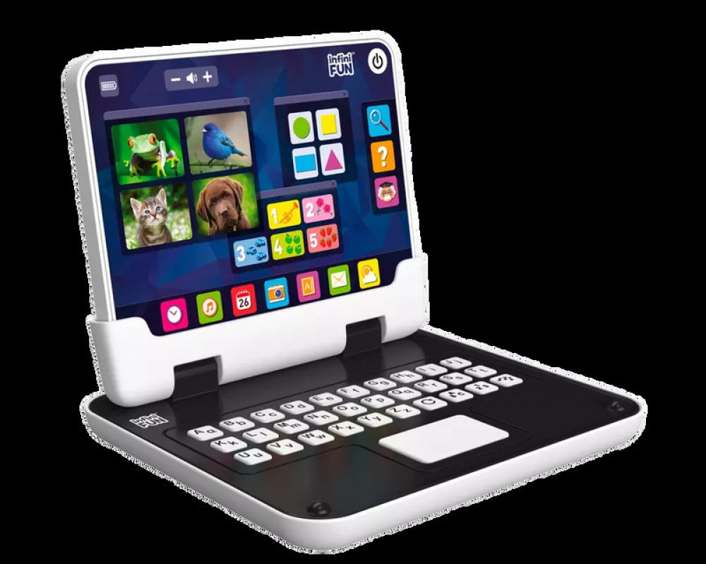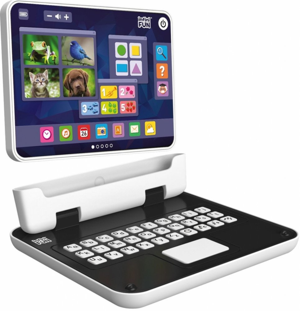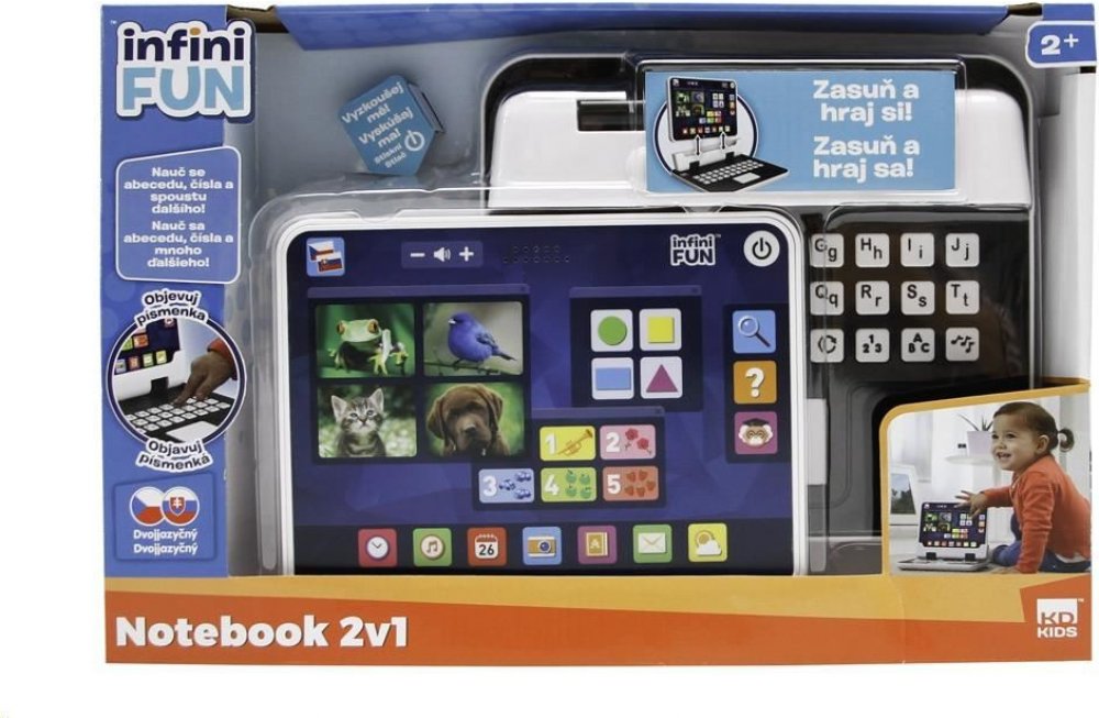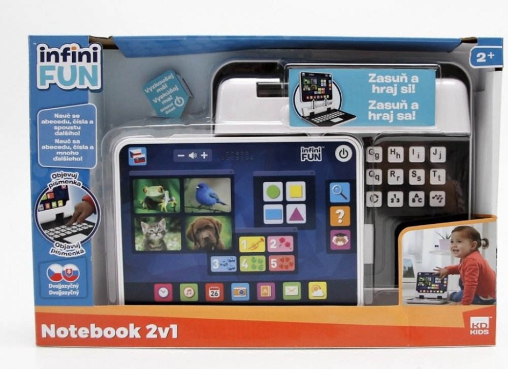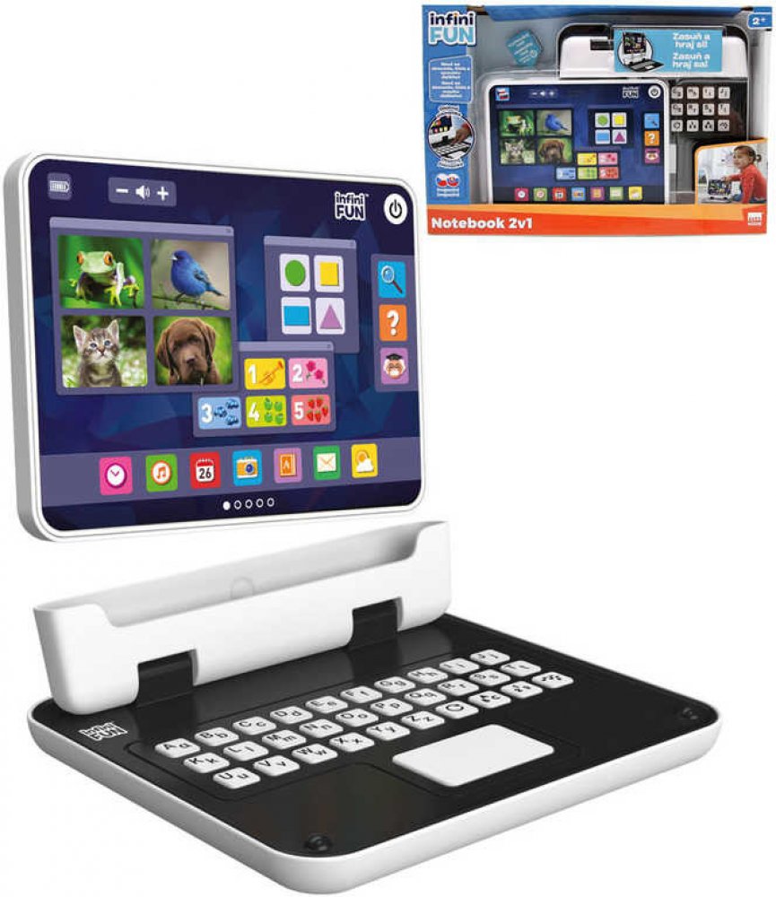 Tablet 2 v 1 může být použit samostatně, nebo s klávesnicí. Děti se pomocí otázek a úkolů učí poznávat zvířátka, barvy, číslice, písmenka, tvary a další. Obsahuje 2 AAA baterie.