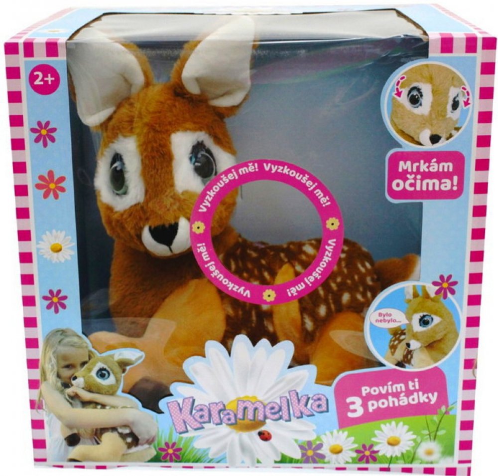 Karamelka ti poví 3 pohádky (Popelka, Zlatovláska a tři medvědi, Na vlásku). Karamelka a mrká očima. Velikost 36cm. Na Vlásku – 1.52 min Zlatovláska – 2.18 min Popelka – 1.52 min. Užij si spoustu zábavy s Karamelkou a poslouchej s ní pohádky.