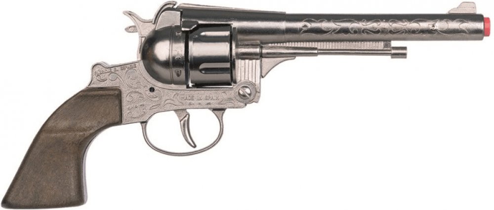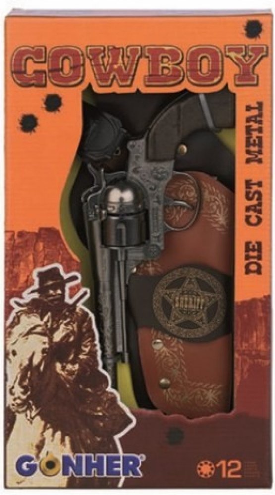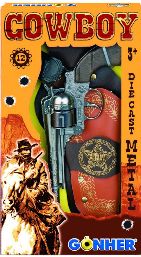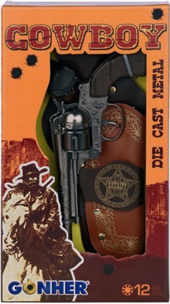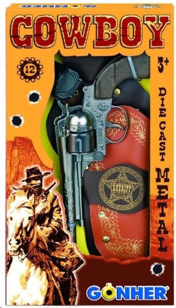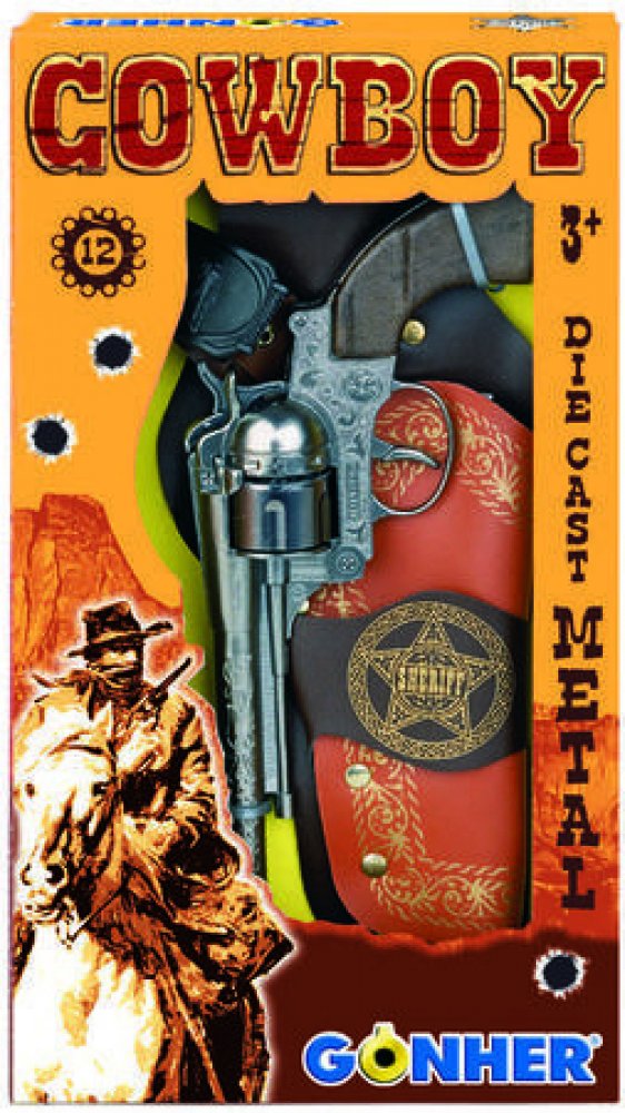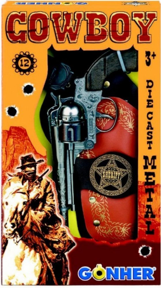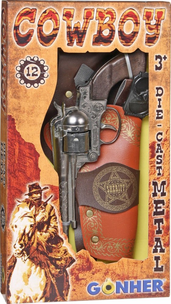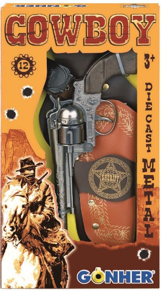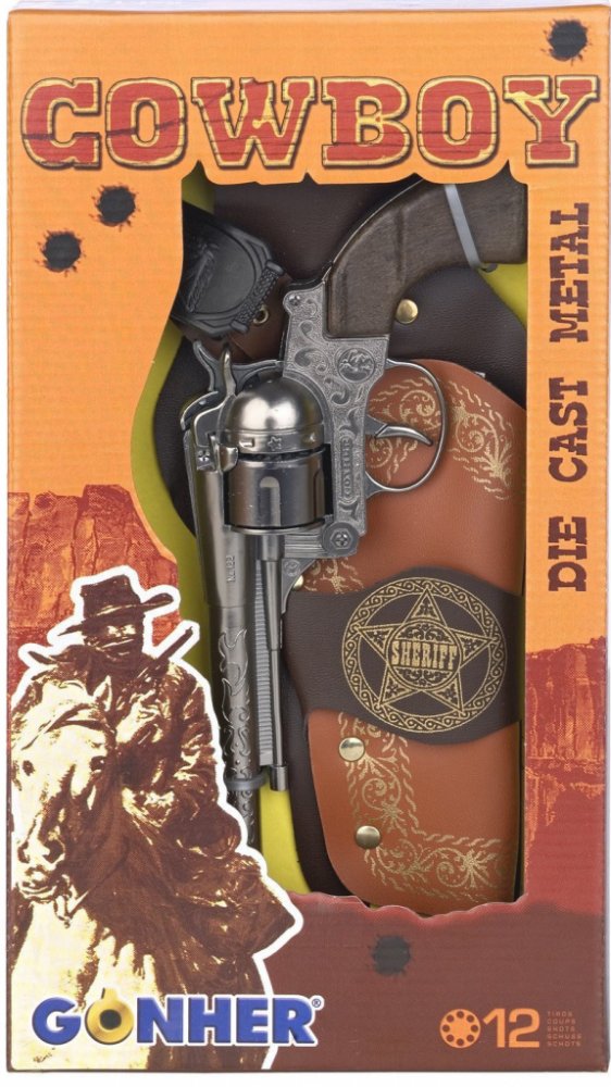 Sada pro kovboje, která udělá radost všem malým pistolníkům z divokého západu. Sada obsahuje: pistoli na kapslíky, pouzdro a koženou šerifskou hvězdu. Pistole je na kapslíky. Rozměr pistole: 24 cm Věk: 3+ Vyrobeno ve Španělsku Kapslíky nejsou součástí balení.