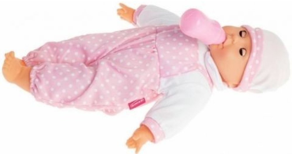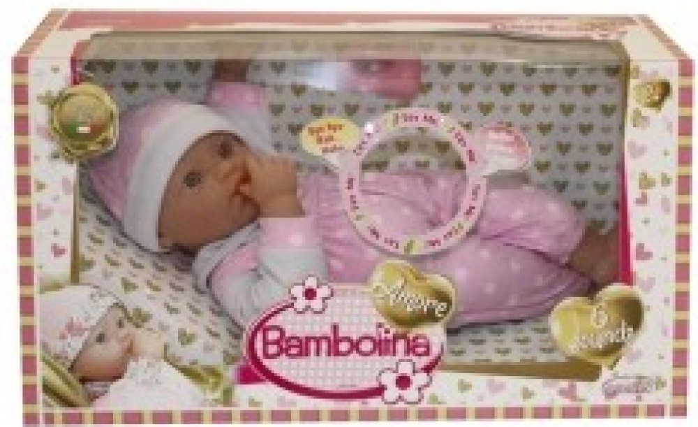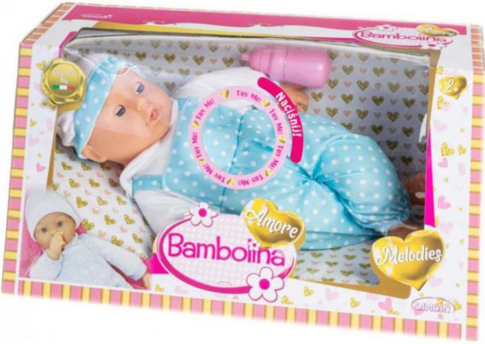 36 cm velké miminko Bambolina Amore. Miminko má měkké tělíčko a hlavička, ručičky a nožičky jsou z vinylu. Miminko vydává 4 melodie a různé dětské zvuky. Výrobek vyžaduje 3× LR44 baterie (baterie nelze vyměnit). Součástí balení je lahvička. Vhodné pro děti od 2 let.
