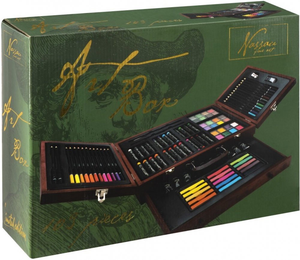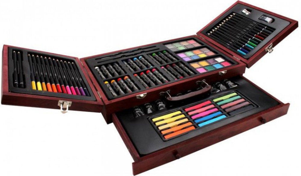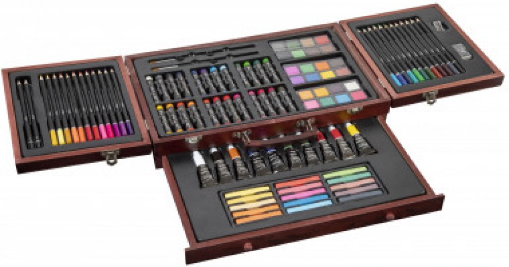 Kreativní výtvarná sada obsahuje 2 grafitové tužky, 1 ořezávátko, 1 guma, 24 pastelek, 24 voskovek, 24 vodových barev, 10 akrylových barev, 15 suchých pastel, 2 štětce (celkem 103 ks) v dřevěném kufříku.