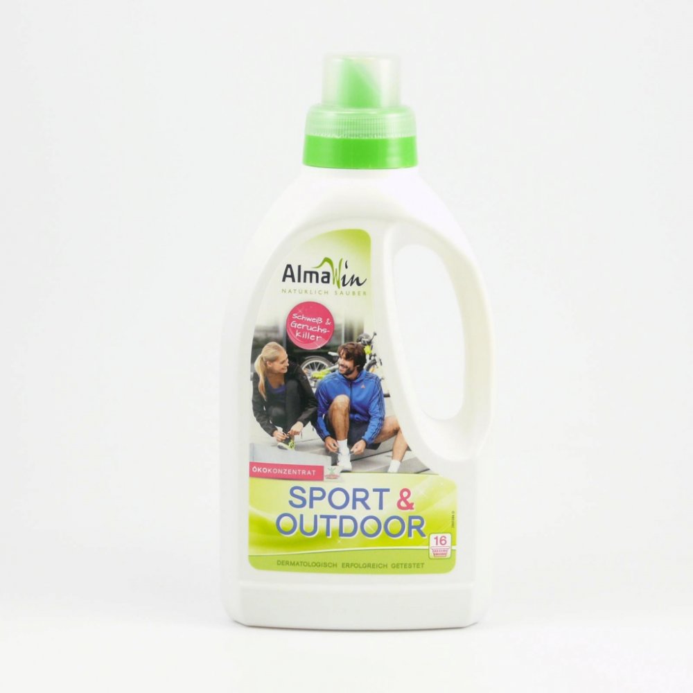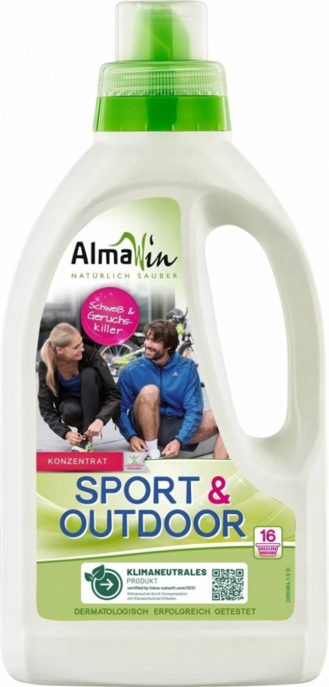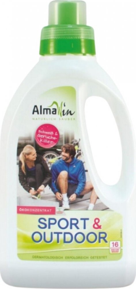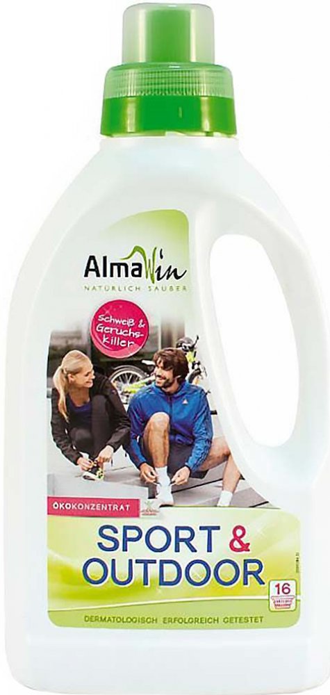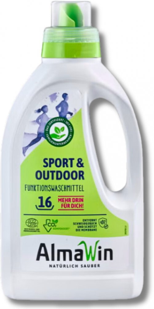 Pracího účinku a tím i ochrany speciálních tkanin je dosaženo jedinečným složením. AlmaWin Sport + Outdoor obsahuje čisté cukerné tenzidy (vyrobené z brambor, kukuřice a cukrové třtiny a cukrové řepy), sulfáty z rostlinných olejů, směs solných kyselin a kyselinu citronovou ke změkčení vody a zlepšení pracího efektu. Neobsahuje mýdlo, které by mohlo narušit ochranné membrány a vlákna. Pro desinfekci a vůni je přidán BIO levandulový éterický olej.