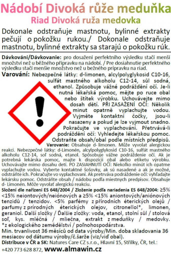 Aplikace: Pro ruční mytí nádobí. Čisticí prostředek AlmaWin používejte střídmě.
