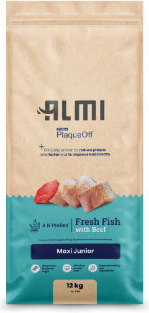 Všechny receptury Almi obsahují mořskou řasu ProDen PlaqueOff, která podporuje přirozenou péči o zuby při každodenním krmení. Pravidelné podávání přispívá k omezení tvorby zubního plaku a podporuje svěží dech.