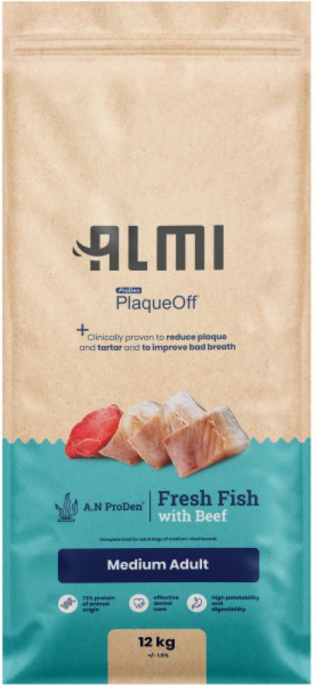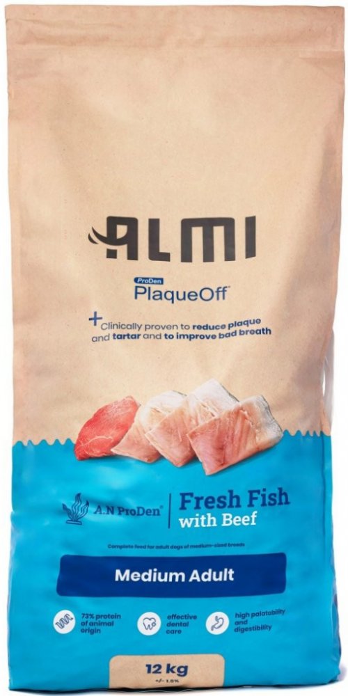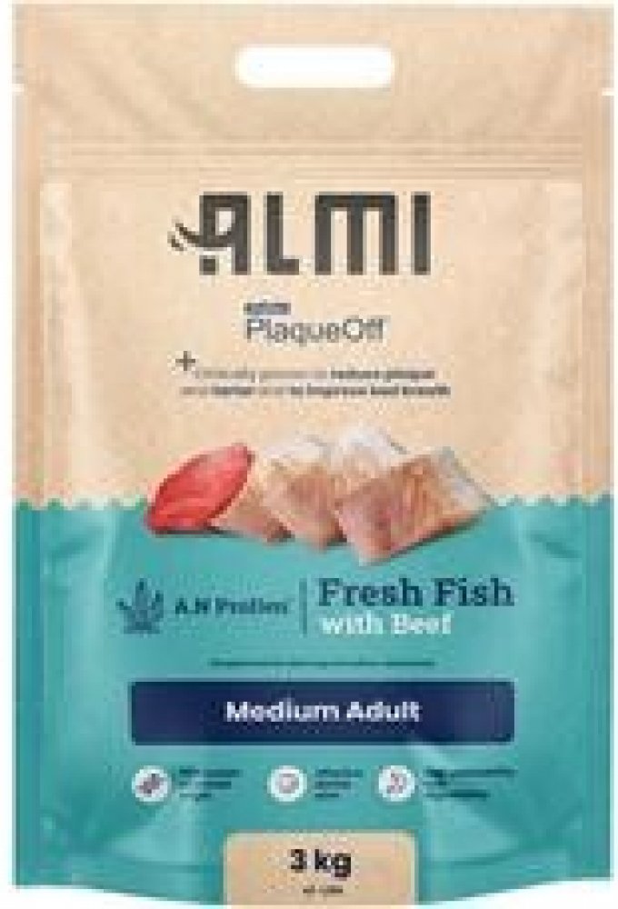 Granule ALMI jsou obohacené o PlaqueOff™, u kterého je klinicky prokázáno, že snižuje zubní plak, zubní kámen a zlepšuje špatný dech. Obsahují vysoký podíl čerstvého rybího masa ze sledě a hovězího masa. Díky tomu zajistí vašemu psovi vyváženou a výživnou stravu bohatou na bílkoviny a tuky pro zdravé svaly, kůži a srst. Pro lepší stravitelnost je v krmivu rýže. Ta je navíc bezlepková, tedy vhodná i pro psy s citlivým žaludkem.