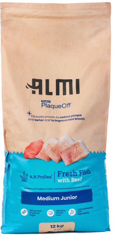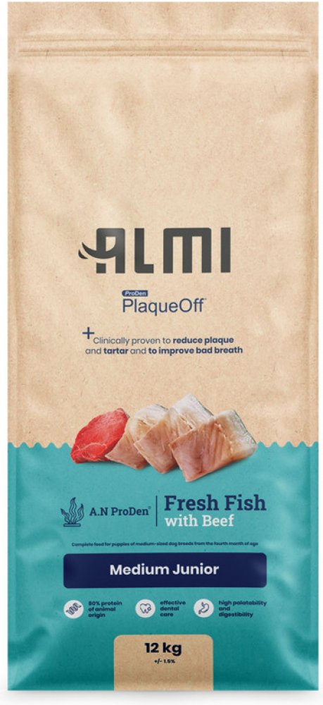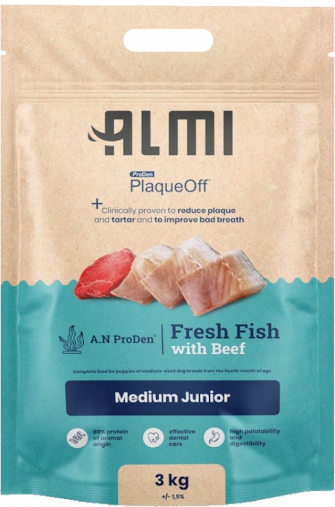 Granule ALMI jsou plné kvalitních surovin, které štěně potřebuje pro zdravý růst a vývoj. Obsahují čerstvou rybu a hovězí maso, které jsou zdrojem bílkovin potřebných pro pevné a silné svaly. Dále je v krmivu hrách, jablka, řepná vláknina a rýže pro lepší stravitelnost. V našem krmivu nenajdete umělá barviva a pro zachování čerstvosti a kvality je přirozeně konzervováno rozmarýnovým extraktem. Granule ALMI jsou obohacené o PlaqueOff™, u kterého je klinicky prokázáno, že snižuje zubní plak, zubní kámen a zlepšuje špatný dech.