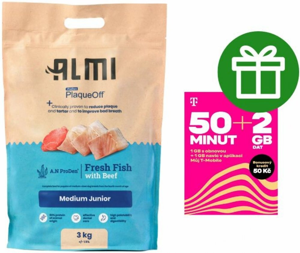 Almi pro štěňata pro střední plemena s běžnou aktivitou hovězí Almi 3 kg superprémiové suché Medium Junior 29 % rýže ze Švédska nízká (<200 mg) 17.9 % 3.2 % 1.2 % 0.8 % 6 % vysoká deklarováno (>40%) preventivní (p>1,0%) základní pro citlivé trávení (7–10 dní) základní možné částečná (země výroby)