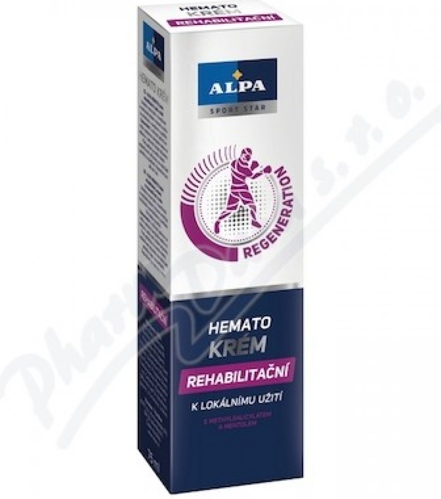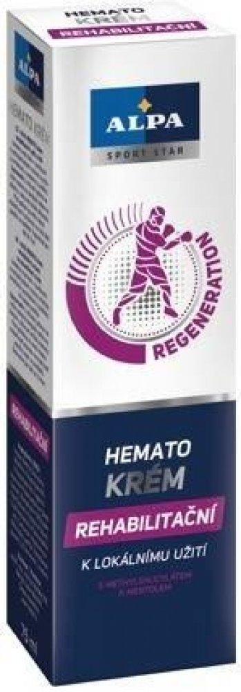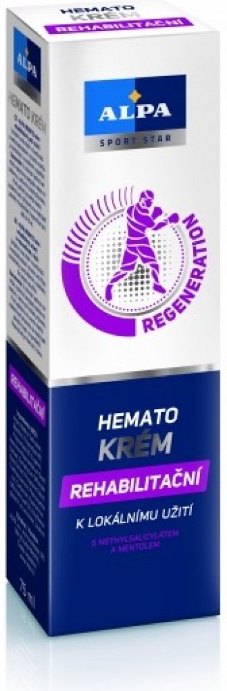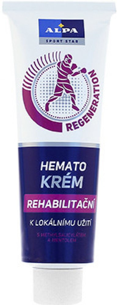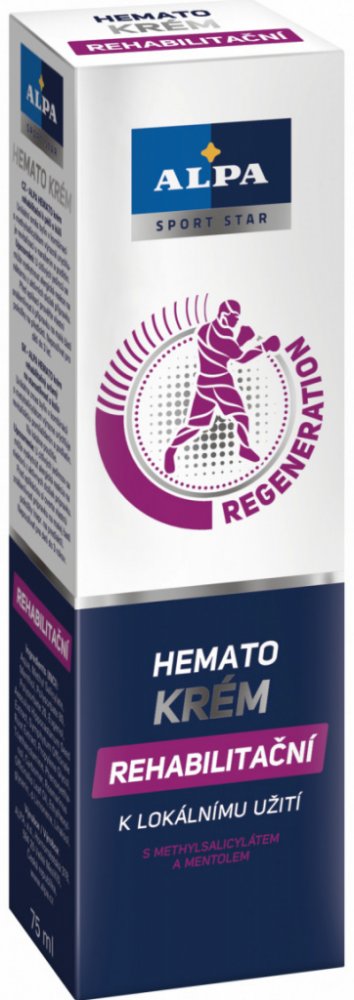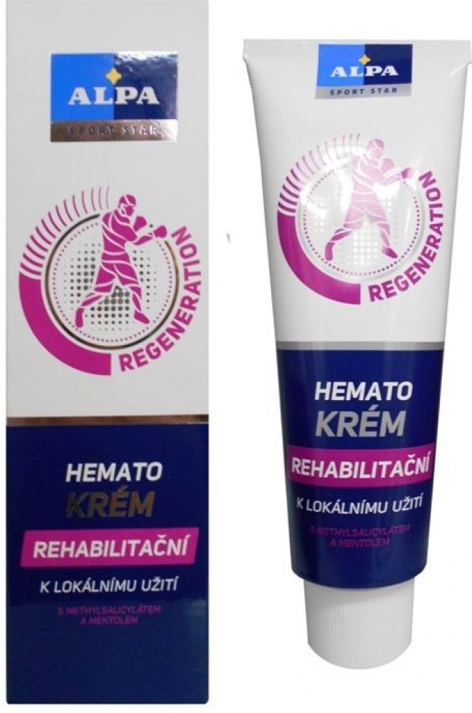 - rehabilitační krém Alpa Hemato s unikátní směsí bylin v kombinaci s methylsalicylátem výrazně urychluje rehabilitaci pohybového aparátu při sportovních zraněních a úrazech, jako jsou zhmoždění, výrony, vymknutí, vykloubení a namožení svalů. Při masáži napomáhá dosažení příznivých účinků při obtížích pohybového aparátu