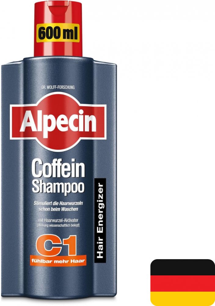 Kofeinový šampon Alpecin posiluje oslabené vlasové kořínky a předchází dědičnému úbytku vlasů, který ohrožuje až 96 % mužů. Přípravky Alpecin využívají v účinném boji proti plešatosti kofein. Kofein brání negativnímu působení testosteronu (DHT) přímo ve vlasových koříncích a zajišťuje tím dostatečné množství energie potřebné k růstu vlasů. Alpecin Coffein C1 Energizer je šampon, který stimuluje růst vlasů přímo u vlasového kořínku. Posiluje oslabené vlasové kořínky. Vlasy jsou tak pevnější a drží se tam, kde je jejich místo.