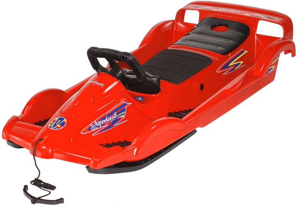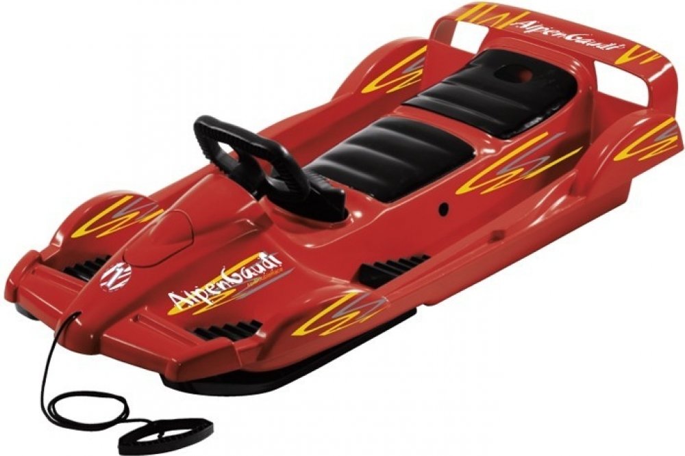 Boby AlpenGaudi DoubleRace to je zábava pro 2 v designu formule 1! Dětské dvoumístné volantem řiditelné boby, to je sen každého kluka. Prostor pro pilota i co-pilota. Opěrky pro nohy pro extra stabilitu. Masivní ocelové tyče řízení. Tvarování a konstrukce lyžin zajišťuje stabilitu ve všech zatáčkách. Robustní ruční brzdy s kovovými drápy. S odkládací schránku na rukavice apod. Včetně lana na táhnu...