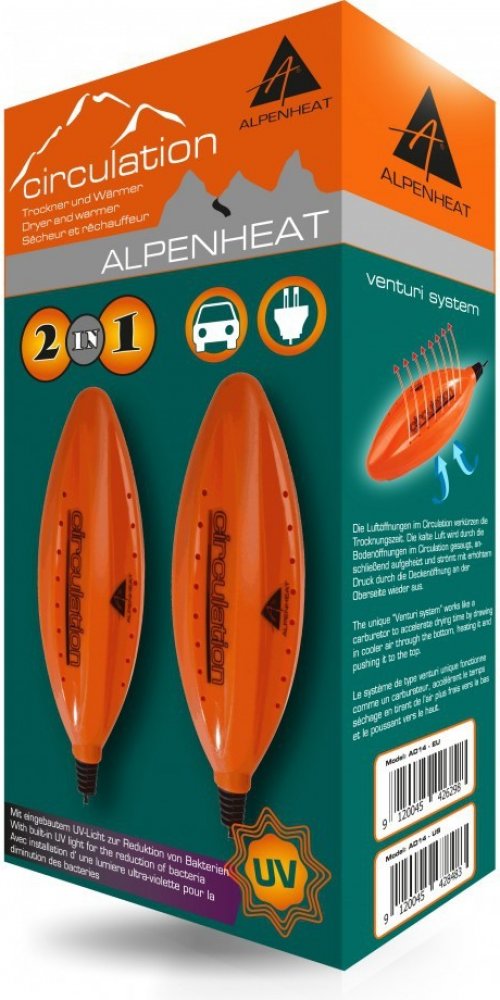 AlpenHeat Circulation UV je cenově dostupný, přenosný vysoušeč, který celoplošně vysouší za pomoci teplého vzduchu. Není to fén, takže v něm nedochází k pohybu žádných součástí. Jde o vysoušeč a vyhřívač v jednom, takže může být ideálně použitelný i jako předehřívač studených bot. Tento model navíc vyzařuje světlo v UV spektru a ničí tak množící se bakterie ve vašich botách. Circulation UV vysouší, vyhřívá a odstraňuje nepříjemné pachy.