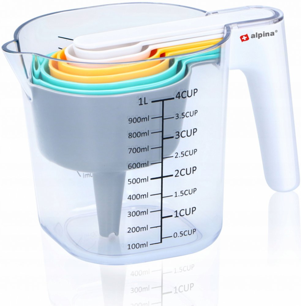 9dílná sada odměrek od Alpiny nesmí chybět v žádné kuchyni. Díky technologii stohování nejen šetří místo, ale je také všestranná. Velká odměrka má metrické značení a má kapacitu 1 litr. 6 malých odměrek má kapacitu 7,5...250 ml.Dodávka obsahuje nálevku a škrabku.