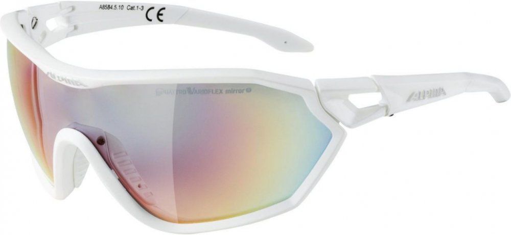 Sportovní fotochromatické a polarizační brýle Alpina S-WAY. Samozatmavující se zrcadlové zorníky spolu s polarizačním filtrem, který odstraňuje odlesky, nezamlžující se úprava a voduodpuzující systém hydrophobic. Toto je nejvyšší model celé řady Alpina S-Way. Sportovní brýle, které jdou s posledním módním trendem tvarů a velikostí rámečků sportovních brýlí. Tyto brýle uspokojí každého sportovce. Jsou to multifunkční sportovní brýle na cyklistiku, lyžování, běhání, turistiku, vodní sporty... Brýle mají seřizovatelné nosníky, díky kloubu mají nastavitelné 3 polohy nožiček vůči zorníkům a koncovky nožiček jsou z tvarovatelného materiálu, takže si je můžete ohnout podle velikosti Vaší hlavy. Jsou zde nově použity hydrofobní zorníky, jejichž povrchová nanostruktura spolehlivě odpuzuje vodu. Pokud Vás tedy na kole překvapí déšť, nemusíte si brýle již sundávat. Podobná technologie se používá např. u zorníků přileb pilotů F1. Fotochromatické (samozabarvující se) skla Varioflex VL+ jsou již z druhé vývojové generace. Rozsah zabarvení je skrz všechny tři stupně sluneční ochrany S1-S3 (nejsou vhodné do auta!). Jinak řečeno od čirého zabarvení až po velmi tmavé. Obrázek s rozdílně zatmavenými skly je možné vidět pod hlavní fotkou brýlí. Rychlost zatmavení je velmi rychlé v řádu několika sekund. Je nutné si uvědomit, že všechny fotochromatické filtry, které způsobují zatmavení, reagují na intenzitu UV záření, proto např. uvnitř auta či v budově nebude zatmavení tak intenzivní, jelikož část UV záření odfiltruje sklo auta či okna. Další nespornou výhodou je, že tyto zorníky mají nezamlžující se povrchovou úpravu Fogstop a polarizační filtr, který odstraňuje odlesky. Zorníky mají "duhové" zabarvení se zrcadlovým povrchem. Šířka zorníků brýlí je 14,6 cm, výška zorníků je 5,4 cm a délka brýlí je 15,0 cm. Váha je 30,5g.