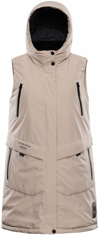 O tepelný komfort se stará silná izolační výplň, prošívaná podšívka a měkký vnitřní límec, které spolehlivě zahřejí i v nepříznivém počasí. Polopřiléhavý střih lichotí ženské postavě a zajišťuje pohodlné nošení. Vesta je vybavena neodepínatelnou kapucí, praktickým dvoucestným zipem a celkem sedmi kapsami – včetně vnitřních hřejivých, ideálních na ruce. Stylový potisk a decentní nášivka na přední části podtrhují moderní charakter tohoto modelu.