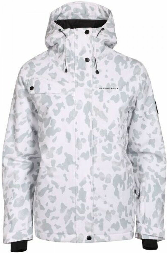 Dámská celopotištěná lyžařská bunda Alpine Pro WEWA je vyrobena z vysoce funkčního materiálu, který je vodoodpudivý, nepromokavý, paropropustný, větruodolný a celopotištěný. Disponuje membránou PTX 10 000 s vodním sloupcem 10 000 mm a paropropustností 10 000 g/m²/24h, doplněnou vodoodpudivou úpravou DWR. Výplň je hřejivá, podšívka kontrastní, přičemž zadní část je navíc tepelně izolovaná, což zajistí komfort i při mrazivém počasí. Bunda má polopřiléhavý střih a podlepené švy pro lepší ochranu proti vlhkosti. Kapuce je neodepínatelná a nastavitelná stahováním. Zapínání je na dlouhý zip. Rukávy jsou anatomicky tvarované, vybavené stahováním v dolní části manžetou se suchým zipem a vnitřní elastickou manžetou na palec pro dokonalé přilnutí. Neodepínatelný sněhový pás zabraňuje pronikání sněhu. Spodní část bundy lze regulovat pomocí stahovací gumičky. K dispozici je pět kapes: na rukávu se zipem na skipas, dvě přední kapsy na zip a vnitřní síťované kapsy. Na předním díle je potisk, nášivka se nachází na rukávu.